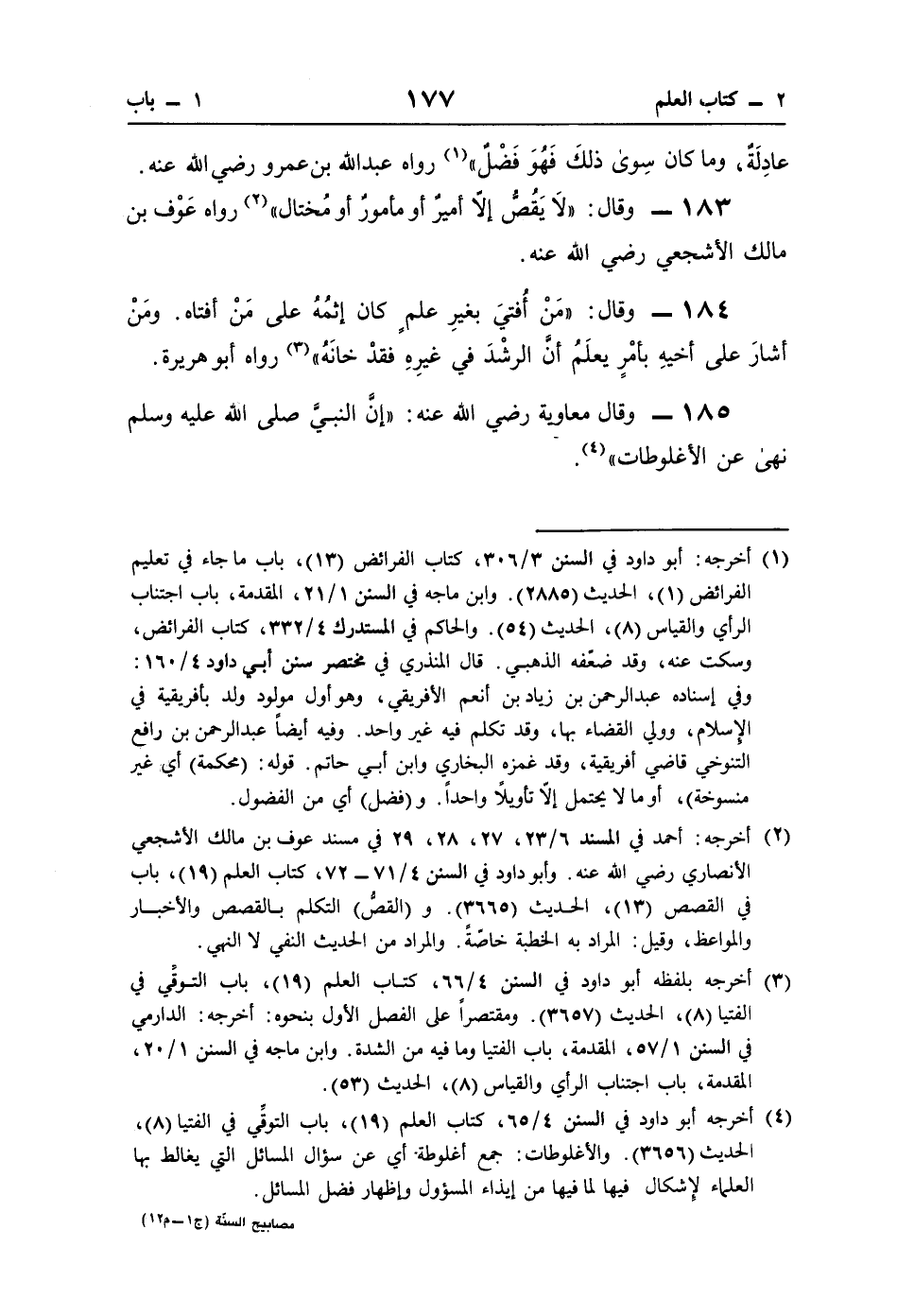 (¬4) أخرجه أبو داود في السنن 4/ 65، كتاب العلم (19)، باب التوقِّي في الفتيا (8)، الحديث (3656). والأغلوطات: جمع أغلوطة أي عن سؤال المسائل التي يغالط بها العلماء لإِشكال فيها لما فيها من إيذاء المسؤول وإظهار فضل المسائل.