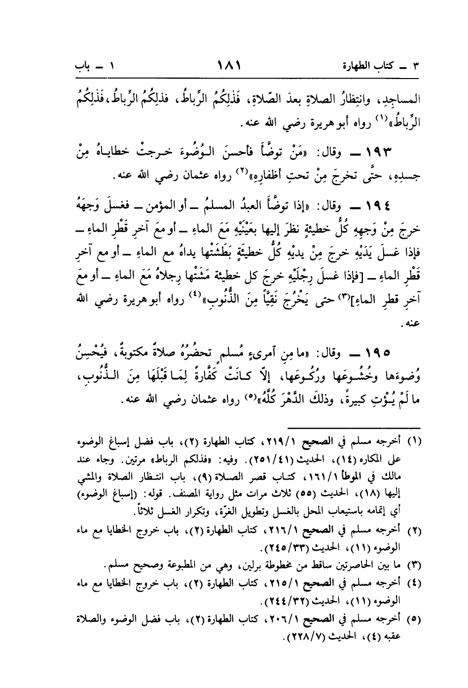 194 - وقال: "إذا توضَّأَ العبدُ المسلمُ -أو المؤمن- فغسلَ وَجهَهُ خرجَ مِنْ وَجهِهِ كُلُّ خطيئةٍ نظرَ إليها بعَيْنَيْهِ مَعَ الماءِ -أو معَ آخرِ قَطْرِ الماءِ- فإذا غسلَ يَدَيْهِ خرجَ مِنْ يديْهِ كُلُّ خطيئَةٍ بَطَشَتْها يداهُ مع الماءِ -أو مع آخرِ قَطْرِ الماءِ-[فإذا غسلَ رِجْلَيْهِ خرجِ كل خطيئة مَشَتْها رِجلاهُ مَعَ الماءِ -أو معَ آخرِ قطرِ الماءِ] (¬3) حتى يَخْرُجَ نَقِيًّا مِنَ الذُّنُوبِ" (¬4) رواه أبو هريرة رضي اللَّه عنه.