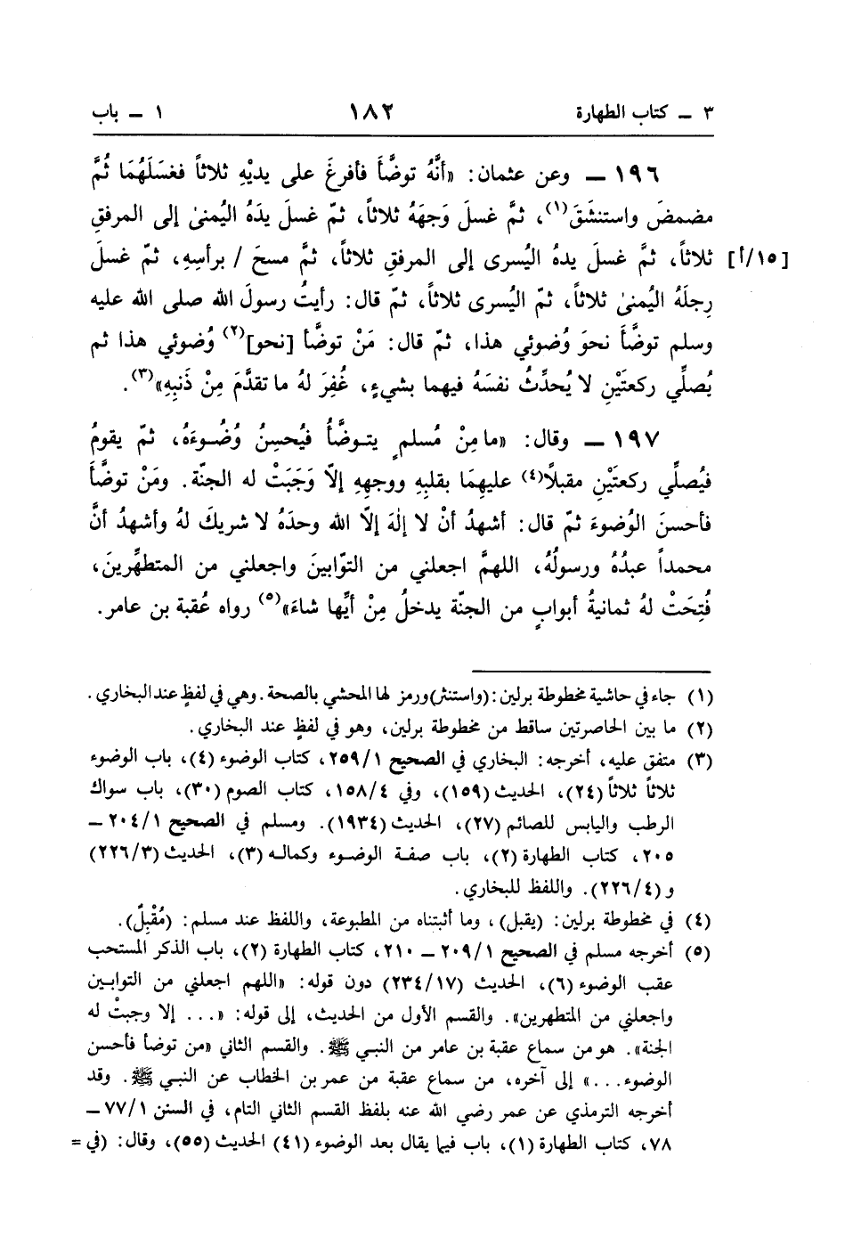 196 - وعن عثمان: "أنَّهُ توضَّأَ فأفرغَ على يديْهِ ثلاثًا فغسَلَهُمَا ثُمَّ مضمضَ واستنشَقَ (¬1)، ثمَّ غسلَ وَجهَهُ ثلاثًا، ثمّ غسلَ يدَهُ اليُمنى إلى المرفقِ ثلاثًا، ثمَّ غسلَ يدهُ اليُسرى إلى المرفقِ ثلاثًا، ثمَّ مسحَ برأسِهِ، ثمّ غسلَ رِجلَهُ اليُمنى ثلاثًا، ثمّ اليُسرى ثلاثًا، ثمّ قال: رأيتُ رسولَ اللَّه صلى اللَّه عليه وسلم توضَّأ نحوَ وُضوئي هذا، ثمّ قال: مَنْ توضَّأ [نحو] (¬2) وُضوئي هذا ثم يُصلِّي ركعتَيْنِ لا يُحدِّثُ نفسَهُ فيهما بشيءٍ، غُفِرَ لهُ ما تقدمَ مِنْ ذَنبِهِ" (¬3).