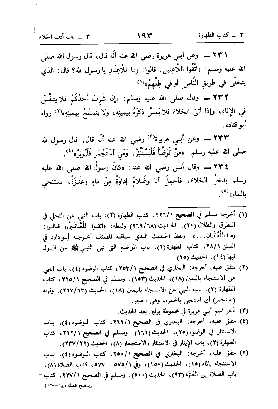 232 - وقال صلى اللَّه عليه وسلم: "إذا شَرِبَ أَحدُكُمْ فلا يتنفَّسْ في الإِناءِ، وإذا أتى الخلاءَ فلا يَمسَّ ذكرَهُ بيمينِهِ، ولا يتمسَّحْ بيمينِهِ" (¬2) رواه أبو قتادة.