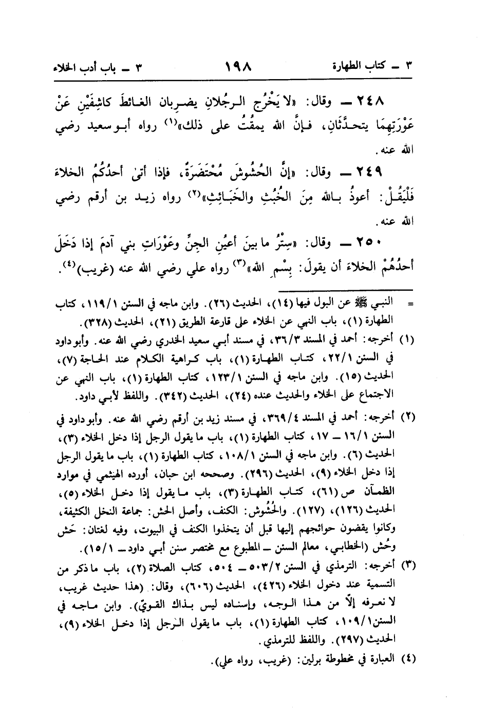 249 - وقال: "إنَّ الحُشُوشَ مُحْتَضَرَةٌ، فإذا أتى أحدُكُمُ الخلاءَ فَلْيَقُلْ: أعوذُ باللَّه مِنَ الخُبُثِ والخَبَائِثِ" (¬2) رواه زيد بن أرقم رضي اللَّه عنه.