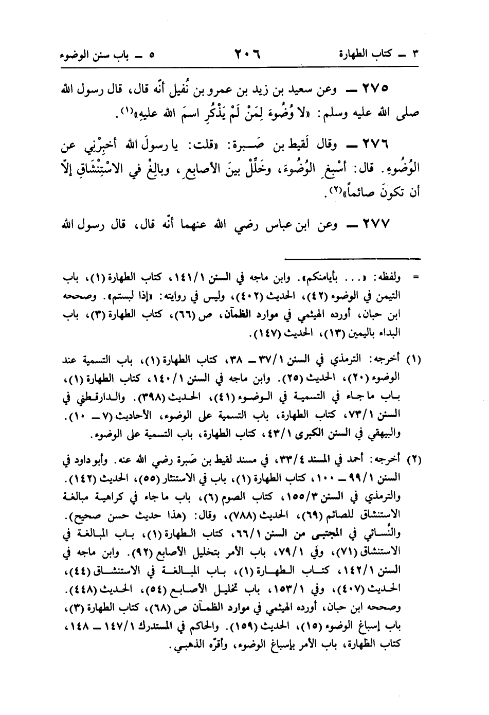 276 - وقال لَقيط بن صَبرة: "قلت: يا رسولَ اللَّه أخبِرْنِي عن الوُضُوءِ. قال: أسْبغِ الوُضُوءَ، وخَلِّلْ بينَ الأصابع، وبالِغْ في الاسْتِنْشَاقِ إلّا أن تكونَ صائمًا" (¬2).