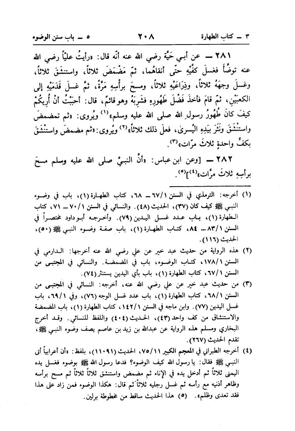 281 - عن أبي حَيَّة رضي اللَّه عنه أنَّه قال: "رأيتُ عليًّا رضي اللَّه عنه توضَّأَ فغسلَ كفَّيْهِ حتّى أنقاهُما، ثمّ مَضْمَضَ ثلاثًا، واستنشَقَ ثلاثًا، وغسلَ وجهَهُ ثلاثًا، وذِرَاعَيْهِ ثلاثًا، ومسحَ برأْسِهِ مَرَّةً، ثمّ غسلَ قَدَمَيْهِ إلى الكعبَيْنِ، ثمّ قامَ فأخذَ فَضْلَ طَهُورِهِ فشَرِبَهُ وهو قائمٌ، قال: أحبَبْتُ أنْ أُرِيكُمْ كيفَ كانَ طُهُورُ رسولِ اللَّه صلى اللَّه عليه وسلم" (¬1) ويُروى: "ثم تمضمضَ واستنْشَقَ ونَثَرَ بيَدِهِ اليُسرى، فعلَ ذلك ثلاثًا" (¬2) ويُروى: "ثم مضمضَ واستنْشَقَ بكفٍّ واحدةٍ ثلاثَ مرّات" (¬3).