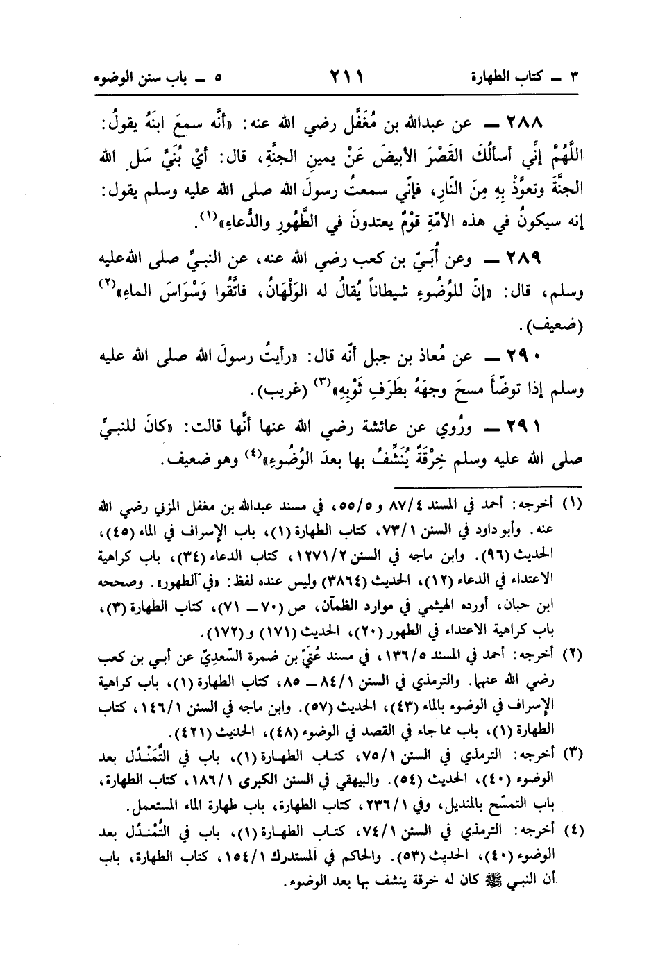 289 - وعن أُبَيّ بن كعب رضي اللَّه عنه، عن النبيِّ صلى اللَّه عليه وسلم، قال: "إنَّ للوُضُوءِ شيطانًا يُقالُ له الوَلْهَانُ، فاتَّقُوا وَسْوَاسَ الماءِ" (¬2) (ضعيف).