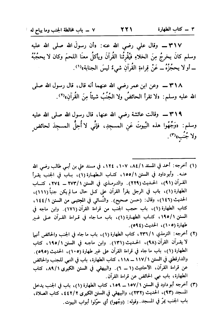 317 - وقال علي رضي اللَّه عنه: "أنَّ رسولَ اللَّه صلى اللَّه عليه وسلم كانَ يخرجُ مِنَ الخلاءِ فيُقْرِئُنا القُرآنَ ويأكلُ معنَا اللحمَ وكان لا يحجُبُهُ -أو لا يحجُزُهُ- عَنْ قِراءةِ القُرآنِ شيءٌ ليسَ الجنابة" (¬1).