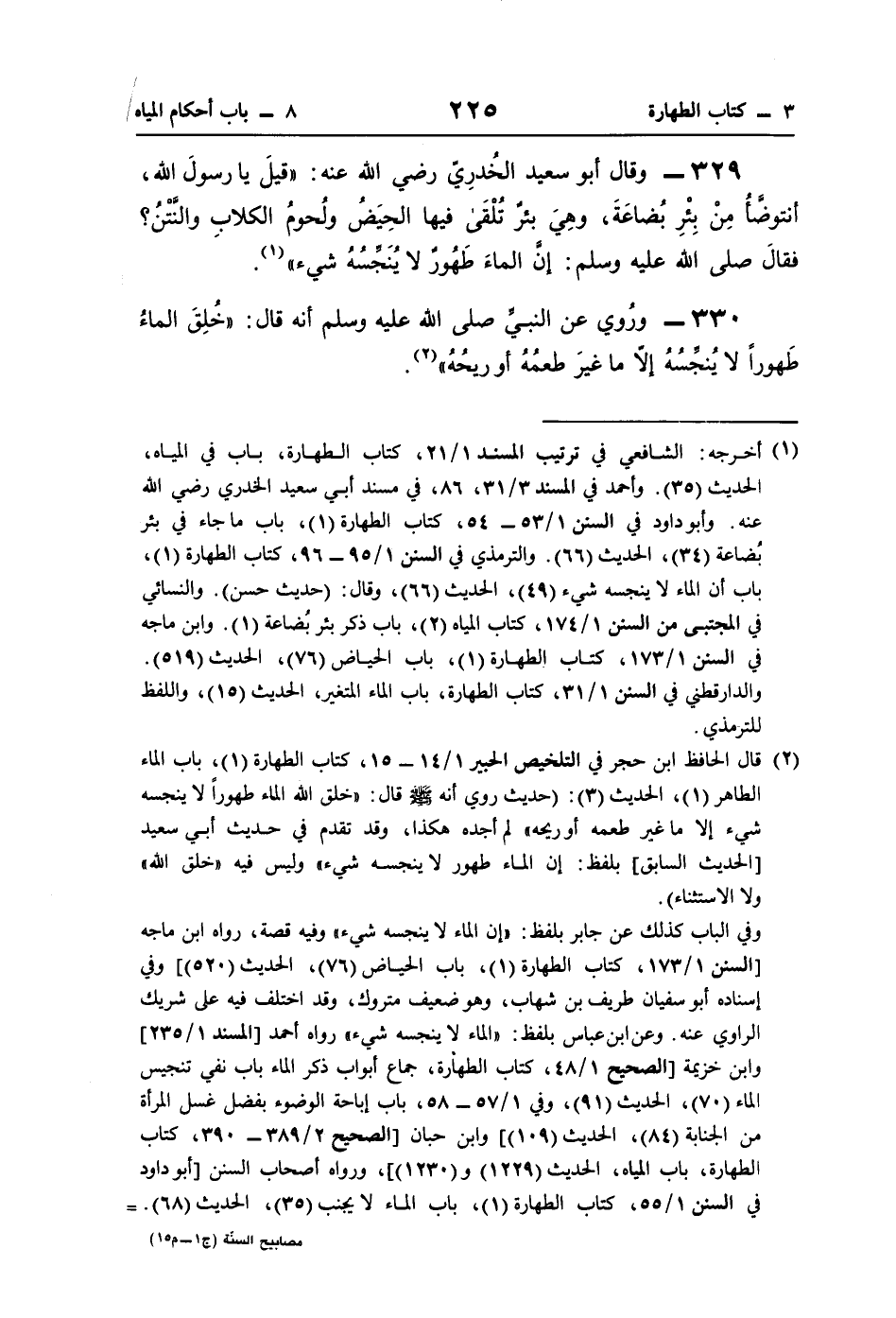 (¬1) أخرجه: الشافعي في ترتيب المسند 1/ 21، كتاب الطهارة، باب في المياه، الحديث (35). وأحمد في المسند 3/ 31، 86، في مسند أبي سعيد الخدري رضي اللَّه عنه. وأبو داود في السنن 1/ 53 - 54، كتاب الطهارة (1)، باب ما جاء في بئر بُضاعة (34)، الحديث (66). والترمذي في السنن 1/ 95 - 96، كتاب الطهارة (1)، باب أن الماء لا ينجسه شيء (49)، الحديث (66)، وقال: (حديث حسن). والنسائي في المجتبى من السنن 1/ 174، كتاب المياه (2)، باب ذكر بئر بُضاعة (1). وابن ماجه في السنن 1/ 173، كتاب الطهارة (1)، باب الحياض (76)، الحديث (519). والدارقطني في السنن 1/ 31، كتاب الطهارة، باب الماء المتغير، الحديث (15)، واللفظ للترمذي.
