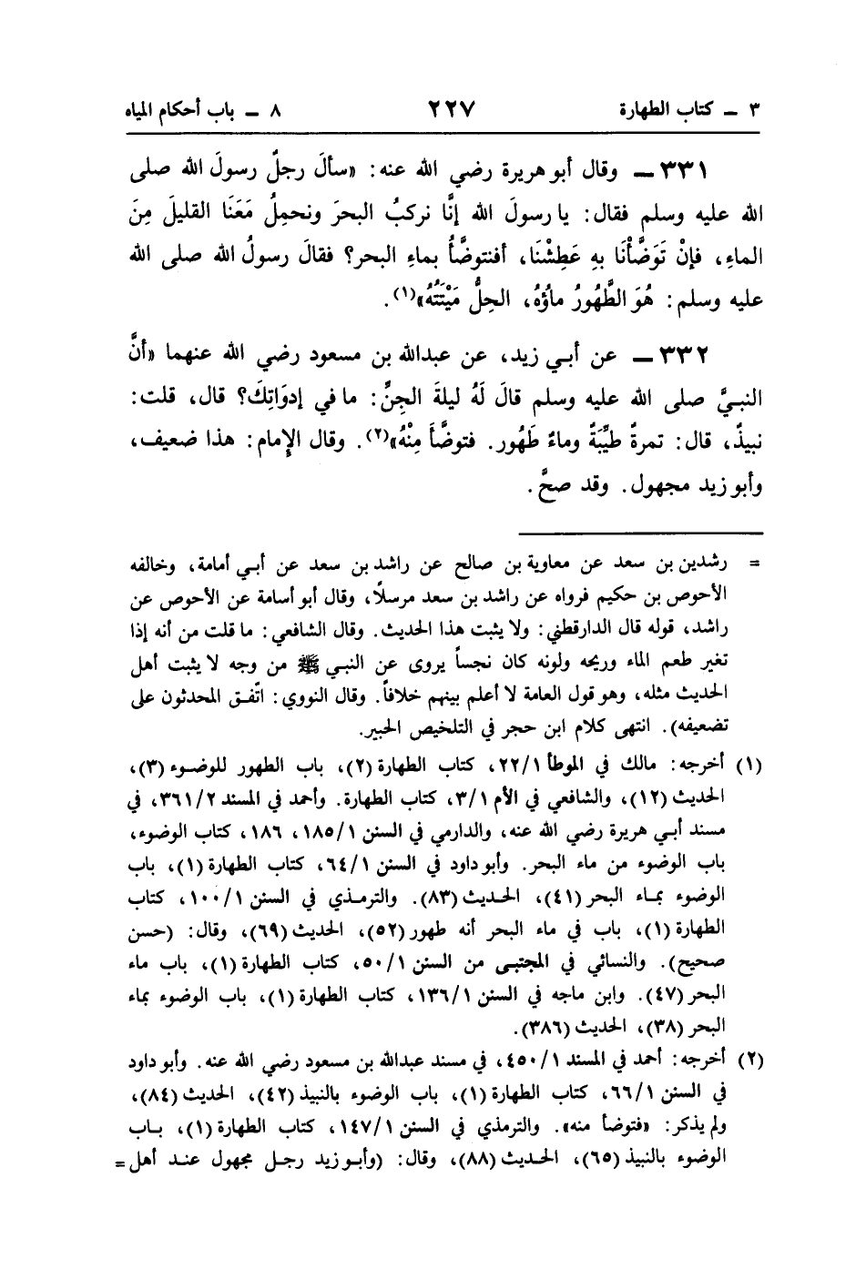 (¬1) أخرجه: مالك في الموطأ 1/ 22، كتاب الطهارة (2)، باب الطهور للوضوء (3)، الحديث (12)، والشافعي في الأم 1/ 3، كتاب الطهارة. وأحمد في المسند 2/ 361، في مسند أبي هريرة رضي اللَّه عنه، والدرامي في السنن 1/ 185، 186، كتاب الوضوء، باب الوضوء من ماء البحر. وأبو داود في السنن 1/ 64، كتاب الطهارة (1)، باب الوضوء بماء البحر (41)، الحديث (83). والترمذي في السنن 1/ 100، كتاب الطهارة (1)، باب في ماء البحر أنه طهور (52)، الحديث (69)، وقال: (حسن صحيح). والنسائي في المجتبى من السنن 1/ 50، كتاب الطهارة (1)، باب ماء البحر (47). وابن ماجه في السنن 1/ 136، كتاب الطهارة (1)، باب الوضوء بماء البحر (38)، الحديث (386).