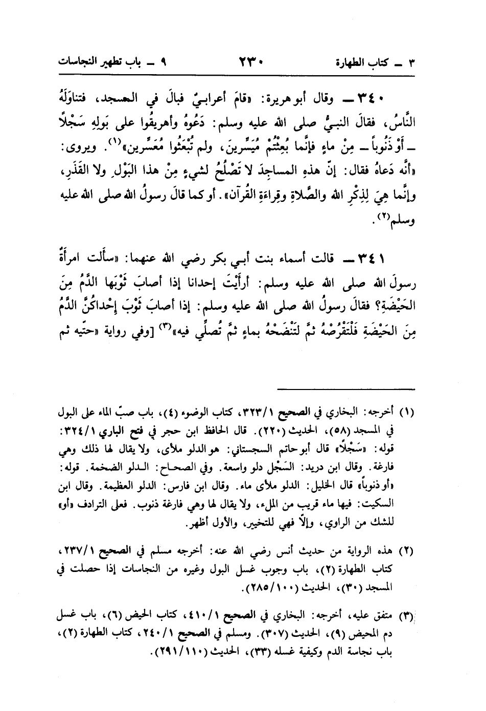 (¬2) هذه الرواية من حديث أنس رضي اللَّه عنه: أخرجه مسلم في الصحيح 1/ 237، كتاب الطهارة (2)، باب وجوب غسل البول وغيره من النجاسات إذا حصلت في المسجد (30)، الحديث (100/ 285).