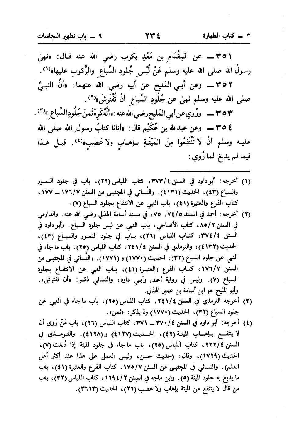 352 - وعن أبي المَليح عن أبيه رضي اللَّه عنهما: "أنَّ النبيَّ صلى اللَّه عليه وسلم نهى عن جُلُودِ السِّباعِ أنْ تُفْتَرشَ" (¬2).