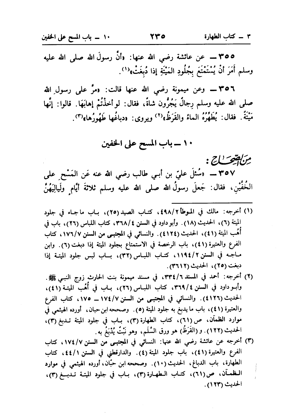 357 - "سُئلَ عليّ بن أبي طالب رضي اللَّه عنه عَن المَسْحِ على الخُفَّيْنِ، فقال: جَعلَ رسولُ اللَّه صلى اللَّه عليه وسلم ثلاثةَ أيَّامٍ ولَيالِيَهُنَّ