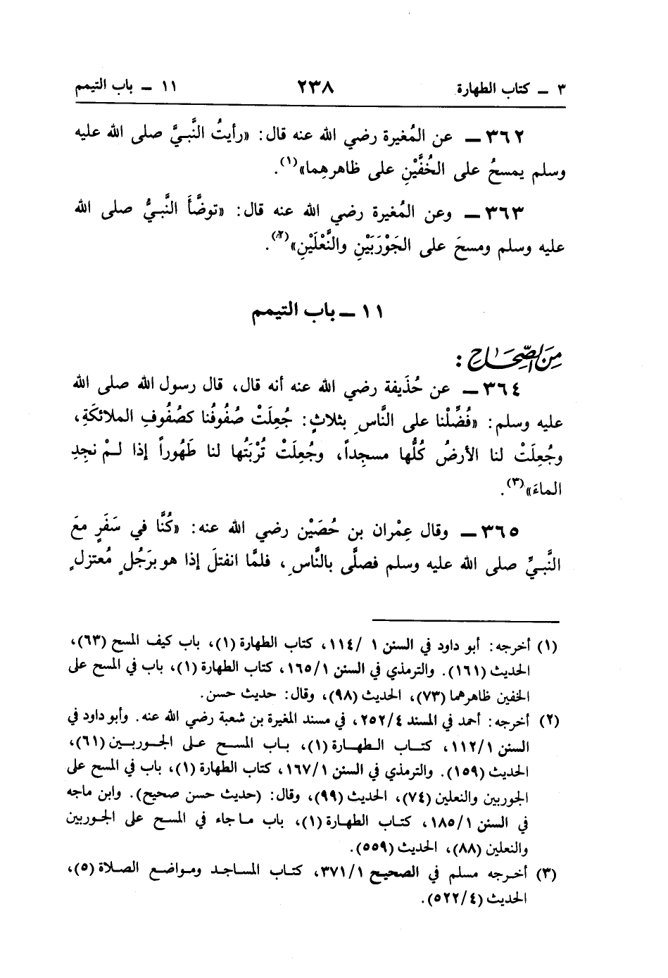 362 - عن المُغيرة رضي اللَّه عنه قال: "رأيتُ النَّبيَّ صلى اللَّه عليه وسلم يمسحُ على الخُفَّيْنِ على ظاهرهِما" (¬1).