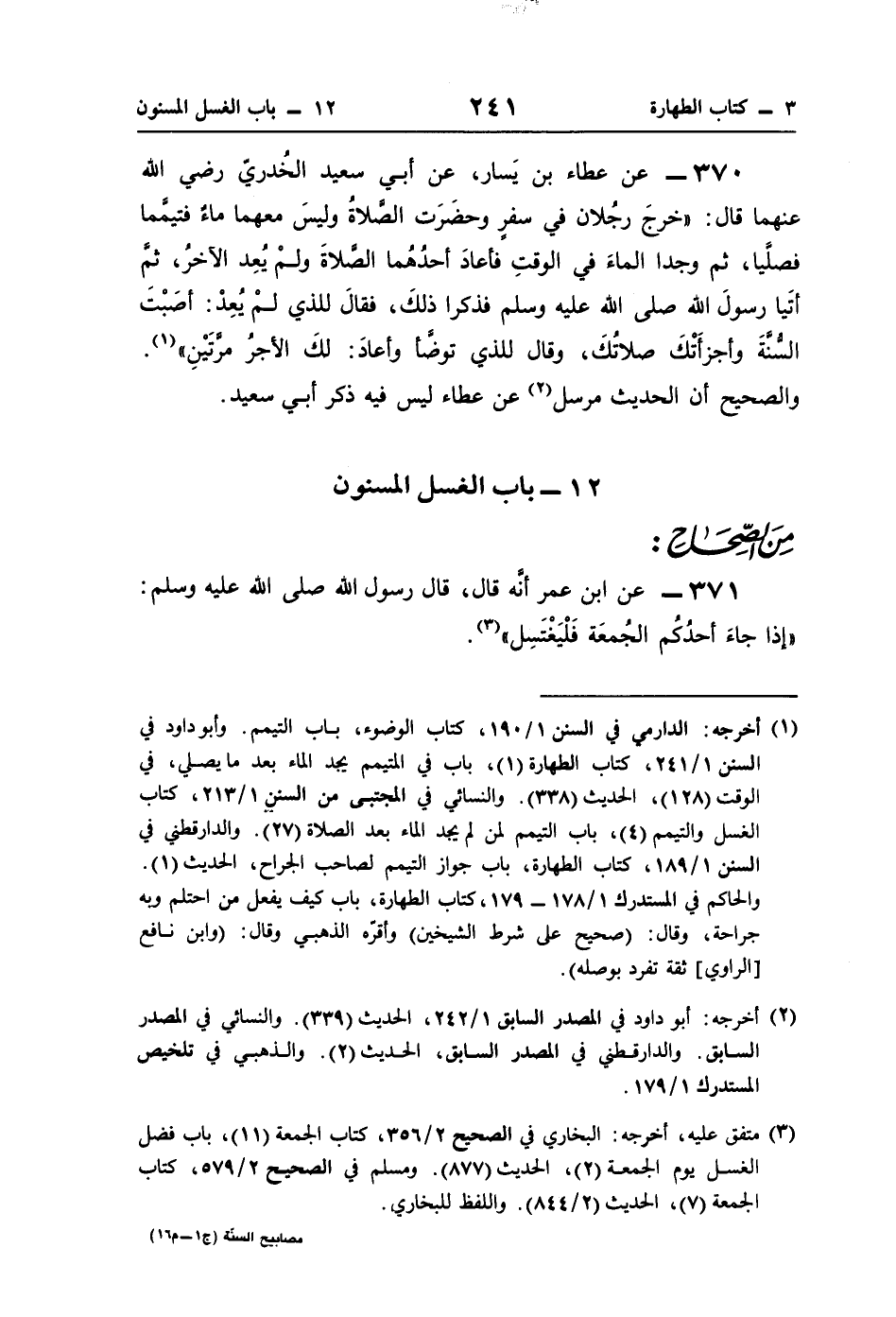 370 - عن عطاء بن يَسار، عن أبي سعيد الخُدريّ رضي اللَّه عنهما قال: "خرجَ رجُلان في سفرٍ وحضَرَت الصَّلاة وليسَ معهما ماءٌ فتيمَّما فصلَّيا، ثمّ وجدا الماءَ في الوقتِ فأعادَ أحدُهُما الصَّلاةَ ولمْ يُعِد الأخرُ، ثمَّ أتَيا رسولَ اللَّه صلى اللَّه عليه وسلم فذكرا ذلكَ، فقالَ للذي لمْ يُعِدْ: أصَبْتَ السُّنَّةَ وأجزأَتْكَ صلاتُكَ، وقال للذي توضَّأ وأعادَ: لكَ الأجرُ مرَّتَيْنِ" (¬1). والصحيح أن الحديث مرسل (¬2) عن عطاء ليس فيه ذكر أبي سعيد.