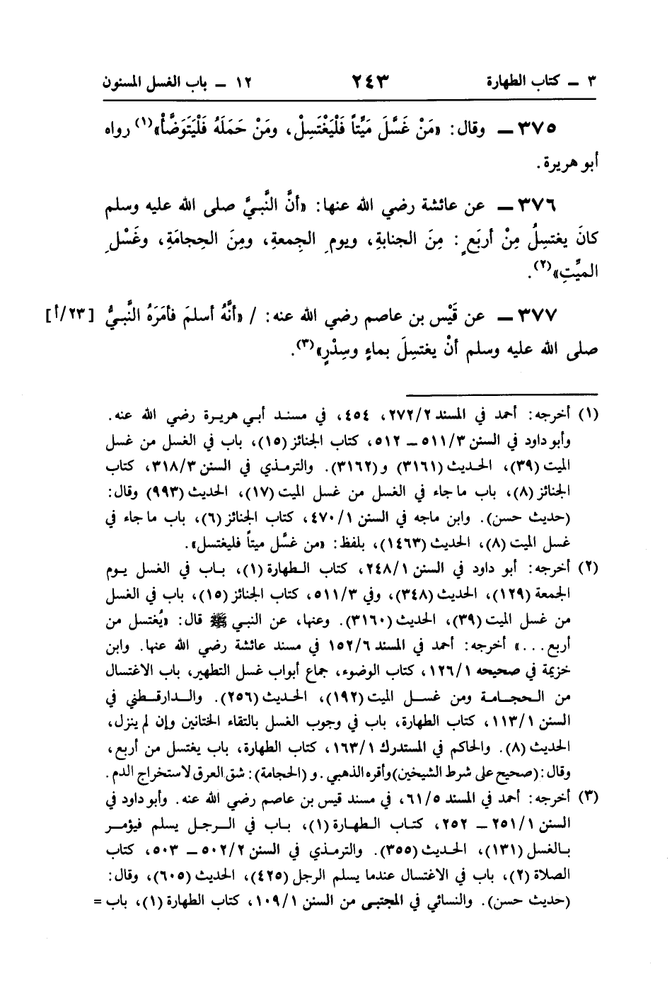 377 - عن قَيْس بن عاصم رضي اللَّه عنه: "أَنَّهُ أسلمَ فأمَرَهُ النَّبيُّ صلى اللَّه عليه وسلم أنْ يغتسِلَ بماءٍ وسِدْرٍ" (¬3).