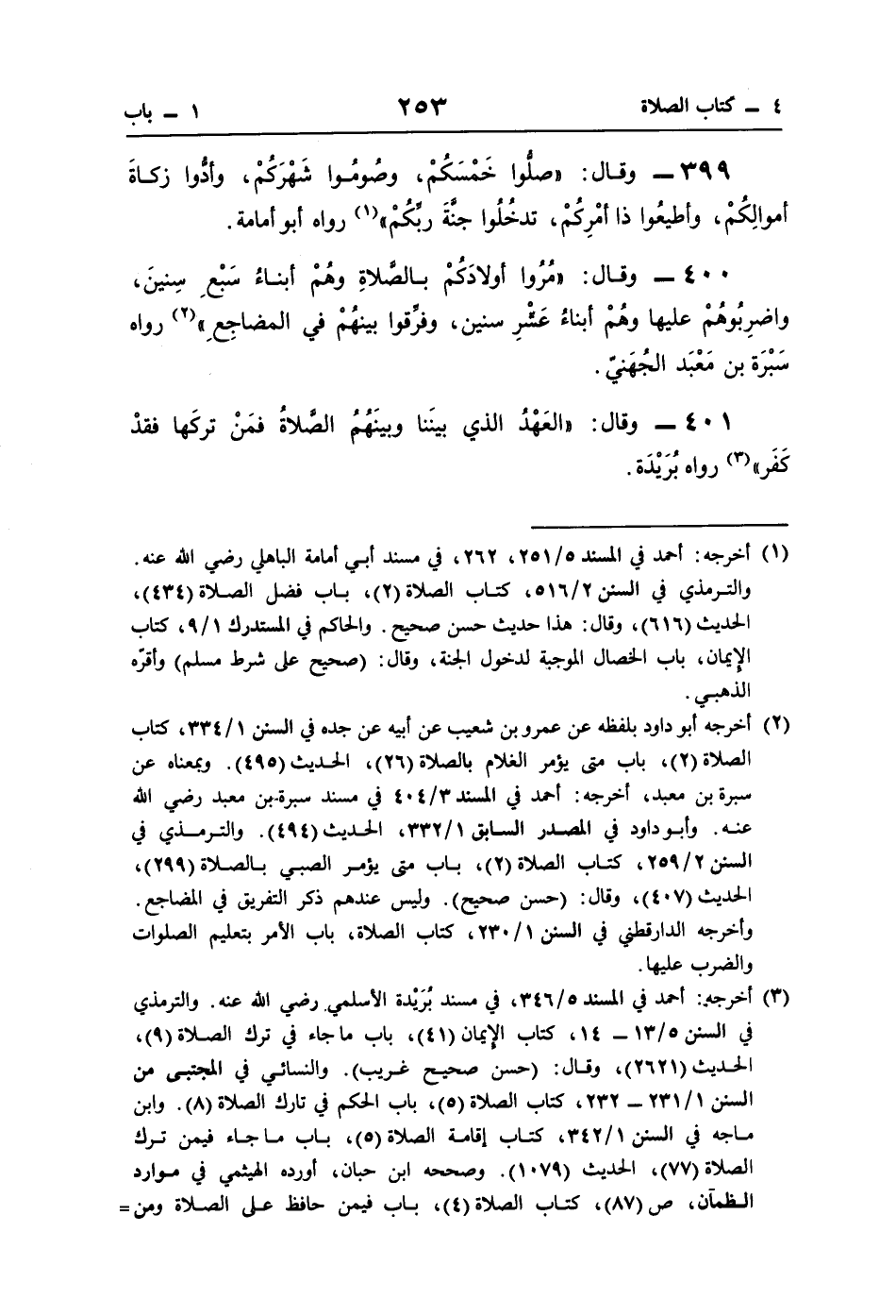 400 - وقال: "مُرُوا أولادَكُمْ بالصَّلاةِ وهُمْ أبناءُ سَبْعِ سِنينَ، واضرِبُوهُمْ عليها وهُمْ أبناءُ عَشْرِ سنين، وفرِّقوا بينهُمْ في المضاجِعِ" (¬2) رواه سَبْرَة بن مَعْبَد الجُهَنيّ.