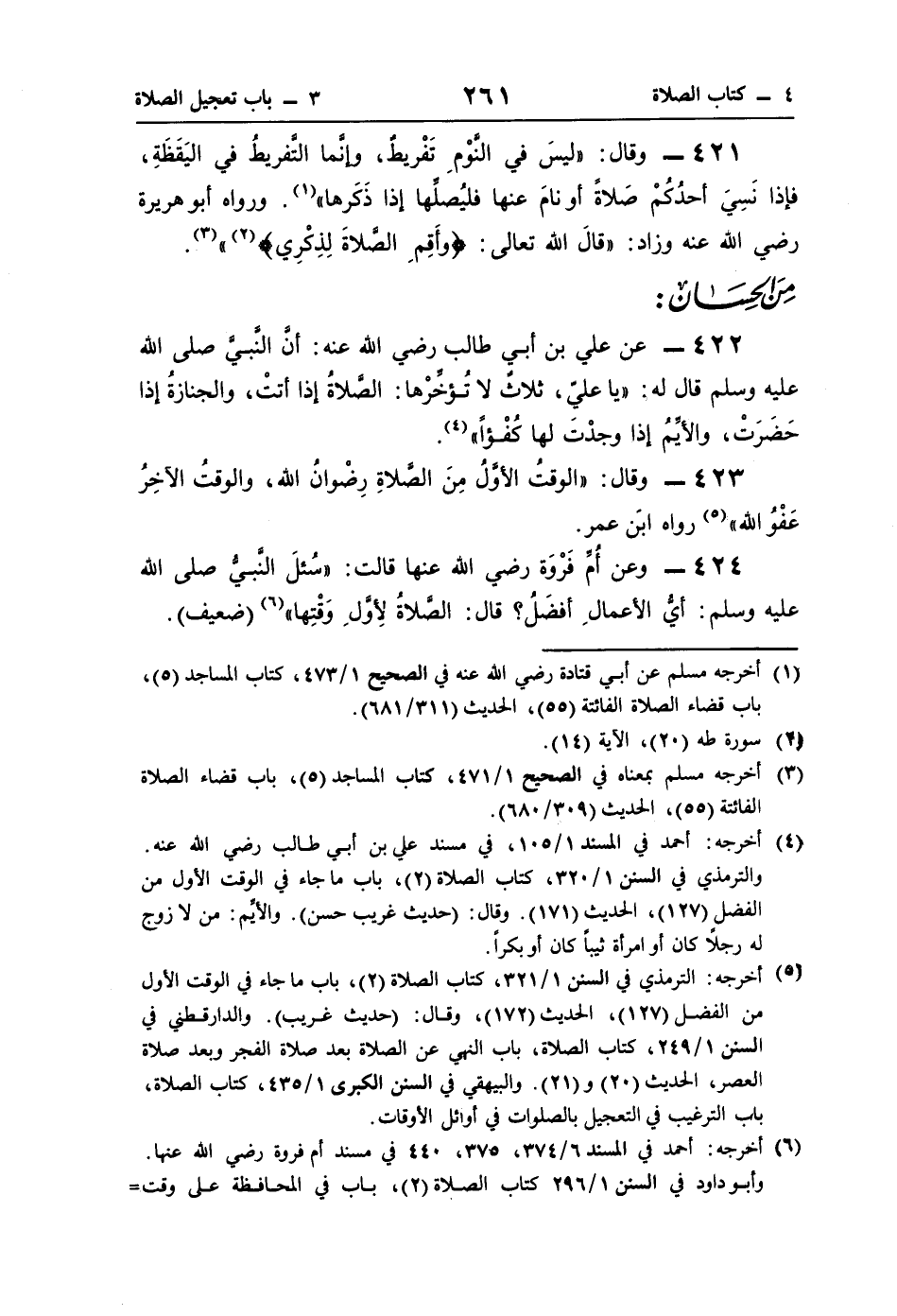 421 - وقال: اليسَ في النوْمِ تَفْريطٌ، وإنَّما التَّفريطُ في اليَقَظَةِ، فإذا نَسِيَ أحدُكُمْ صَلاةً أو نامَ عنها فليُصلِّها إذا ذَكَرها" (¬1). ورواه أبو هريرة رضي اللَّه عنه وزاد: "قالَ اللَّه تعالى: {وَأَقِمِ الصَّلَاةَ لِذِكْرِي} (¬2) " (¬3).
