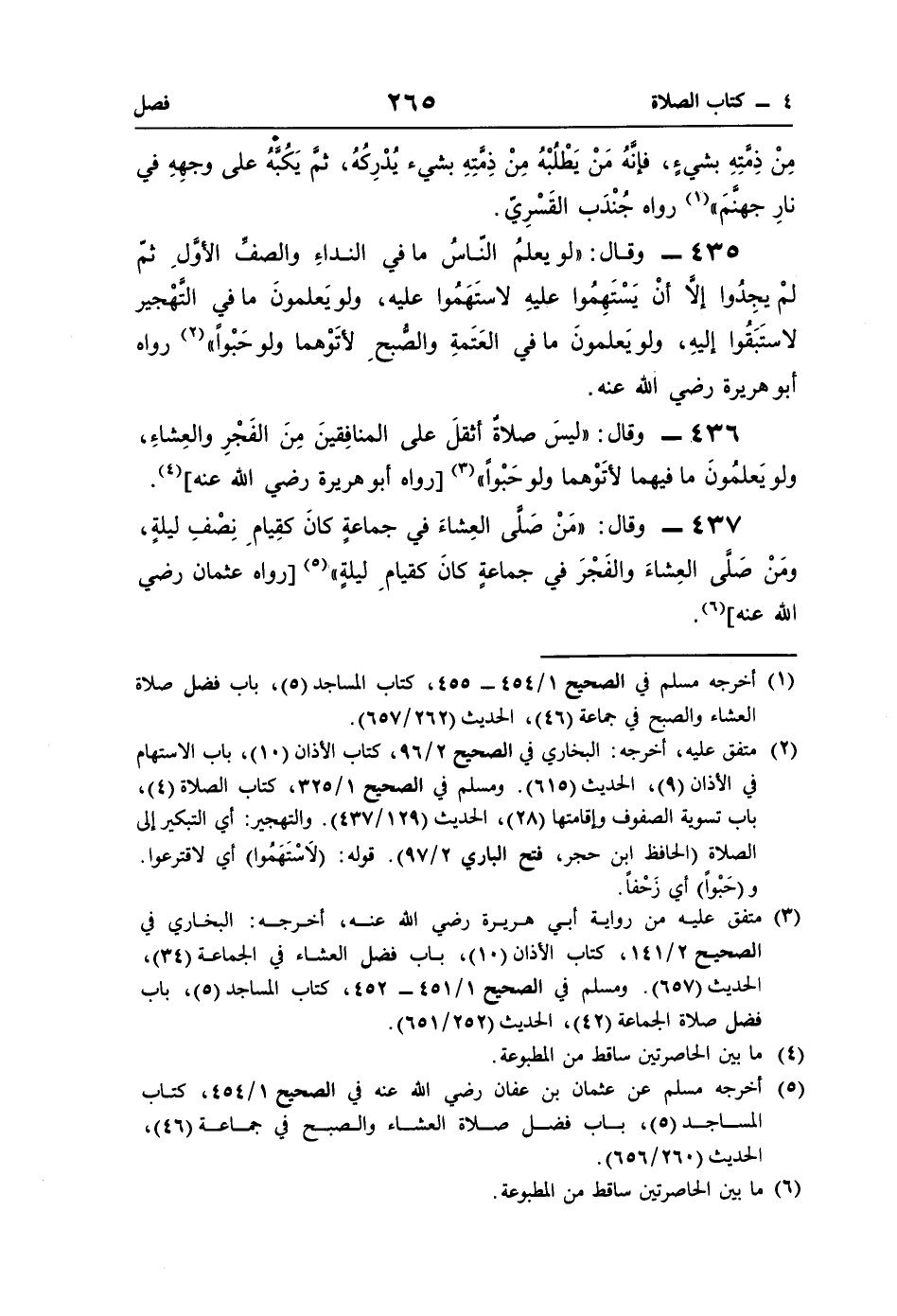 (¬5) أخرجه مسلم عن عثمان بن عفان رضي اللَّه عنه في الصحيح 1/ 454، كتاب المساجد (5)، باب فضل صلاة العشاء والصبح في جماعة (46)، الحديث (260/ 656).