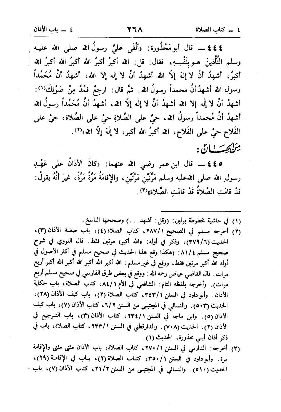 444 - قال أبو مَحْذُورة: "ألْقَى عليَّ رسولُ اللَّه صلى اللَّه عليه وسلم التَّأْذينَ هو بِنَفْسِهِ، فقال: قل: اللَّه أكبرُ أكبرُ اللَّه أكبرُ اللَّه أكبرُ اللَّه أكبرُ، أشهدُ أنْ لا إلهَ إلَّا اللَّه أشهدُ أنْ لا إله إلا اللَّه، أشهدُ أنَّ مُحَمَّدًا رسول اللَّه أشهدُ أنَّ محمدًا رسولُ اللَّه. ثمّ قال: ارجِعْ فمدَّ مِنْ صَوْتِكَ (¬1): أشهدُ أنْ لا إله إلا اللَّه أشهدُ أنْ لا إله إلَّا اللَّه، أشهدُ أنَّ مُحَمَّدًا رسولُ اللَّه أشهدُ أنَّ مُحمَّدًا رسولُ اللَّه، حيَّ على الصَّلاةِ حيَّ على الصَّلاة، حيَّ على الفَلاح حيَّ على الفَلاح، اللَّه أكبرُ اللَّه أكبر، لا إله إلّا اللَّه" (¬2).