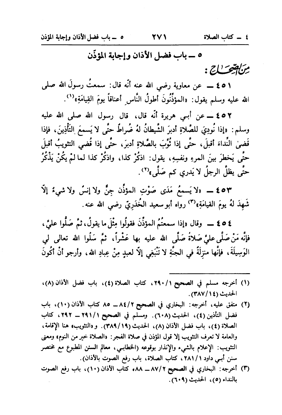 453 - "لا يَسمعُ مَدَى صَوْتِ المؤذِّن جِنٌ ولا إنسٌ ولا شيءٌ إلّا شَهِدَ لهُ يومَ القيامَةِ" (¬3) رواه أبو سعيد الخُدَرِيّ رضي اللَّه عنه.