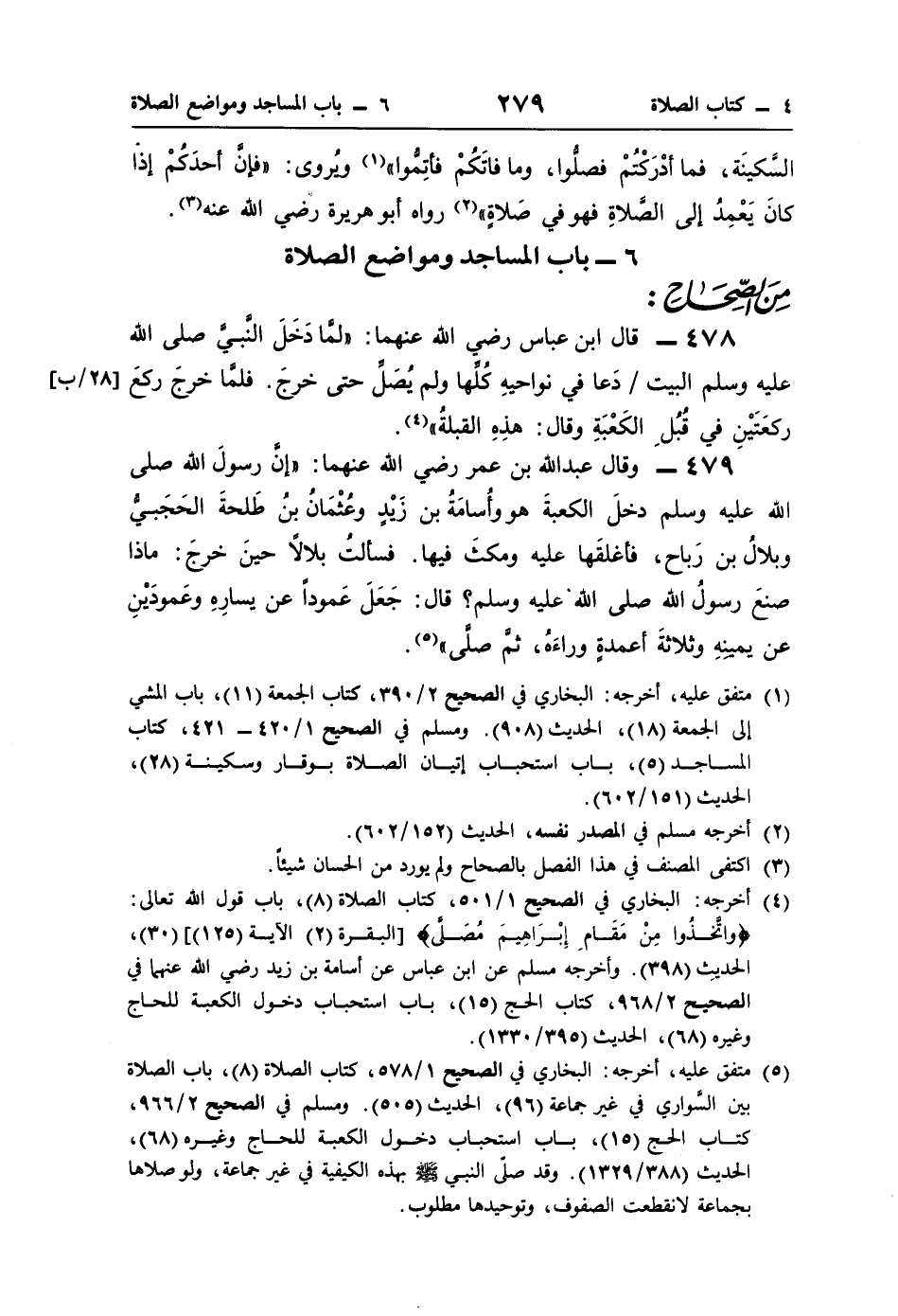 479 - وقال عبد اللَّه بن عمر رضي اللَّه عنهما: "إنَّ رسولَ اللَّه صلى اللَّه عليه وسلم دخلَ الكعبةَ هو وأُسامَةُ بن زَيْدٍ وعُثْمَانُ بنُ طَلحةَ الحَجَبيُّ وبلالُ بن رَباح، فأغلقَها عليه ومكثَ فيها. فسألتُ بلالًا حينَ خرجَ: ماذا صنعَ رسولُ اللَّه صلى اللَّه عليه وسلم؟ قال: جَعَلَ عَمودًا عن يسارِهِ وعَمودَيْنِ عن يمينِهِ وثلاثةَ أعمدةٍ وراءَهُ، ثمَّ صلَّى" (¬5).