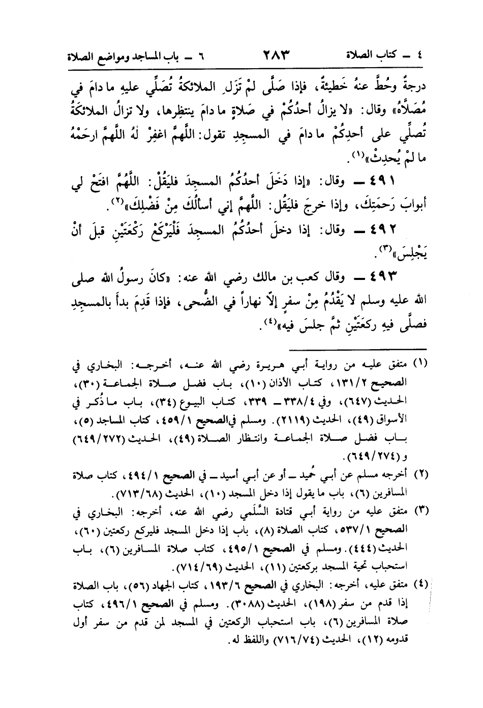 493 - وقال كعب بن مالك رضي اللَّه عنه: "كانَ رسولُ اللَّه صلى اللَّه عليه وسلم لا يَقْدُمُ مِنْ سفرٍ إلَّا نهارًا في الضُّحى، فإذا قَدِمَ بدأَ بالمسجِدِ فصلَّى فيهِ ركعَتَيْنِ ثَمَّ جلسَ فيه" (¬4).