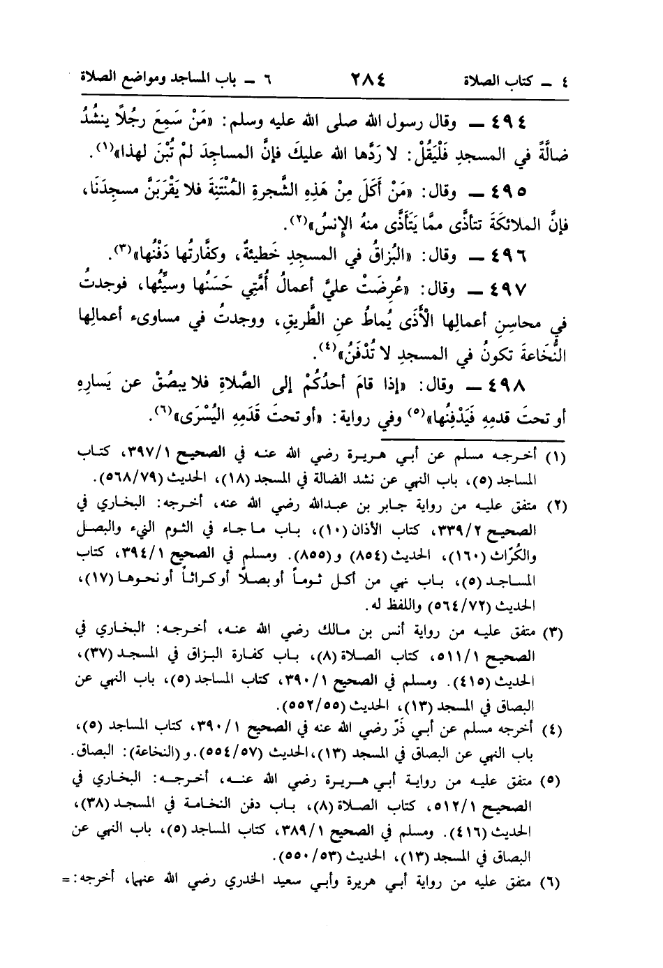 (¬3) متفق عليه من رواية أنس بن مالك رضي اللَّه عنه، أخرجه: البخاري في الصحيح 1/ 511، كتاب الصلاة (8)، باب كفارة البزاق في المسجد (37)، الحديث (415). ومسلم في الصحيح 1/ 390، كتاب المساجد (5)، بات النهي عن البصاق في المسجد (13)، الحديث (55/ 552).