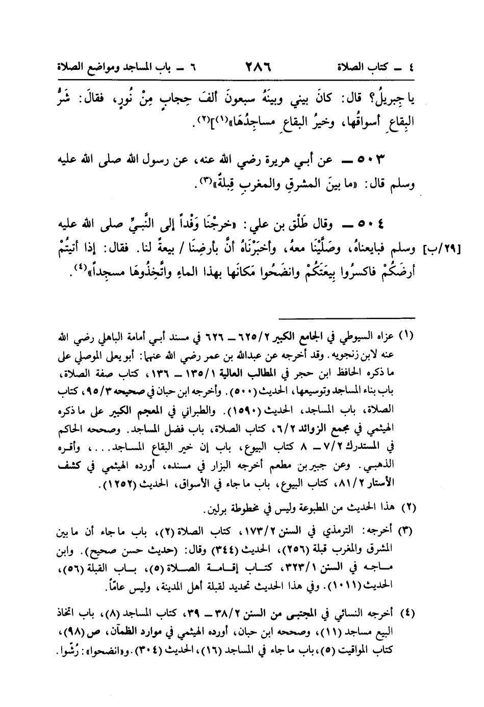 504 - وقال طَلْق بن علي: "خرجْنَا وَفْدًا إلى النَّبيِّ صلى اللَّه عليه وسلم فبايعناهُ، وصَلَّيْنَا معهُ، وأخبَرْنَاهُ أنَّ بأرضِنا بيعةً لنا. فقال: إذا أتيتُمْ أرضَكُمْ فاكسرُوا بِيعَتَكُمْ وانضَحُوا مَكانَها بهذا الماءِ واتَّخِذُوهَا مسجِدًا" (¬4).