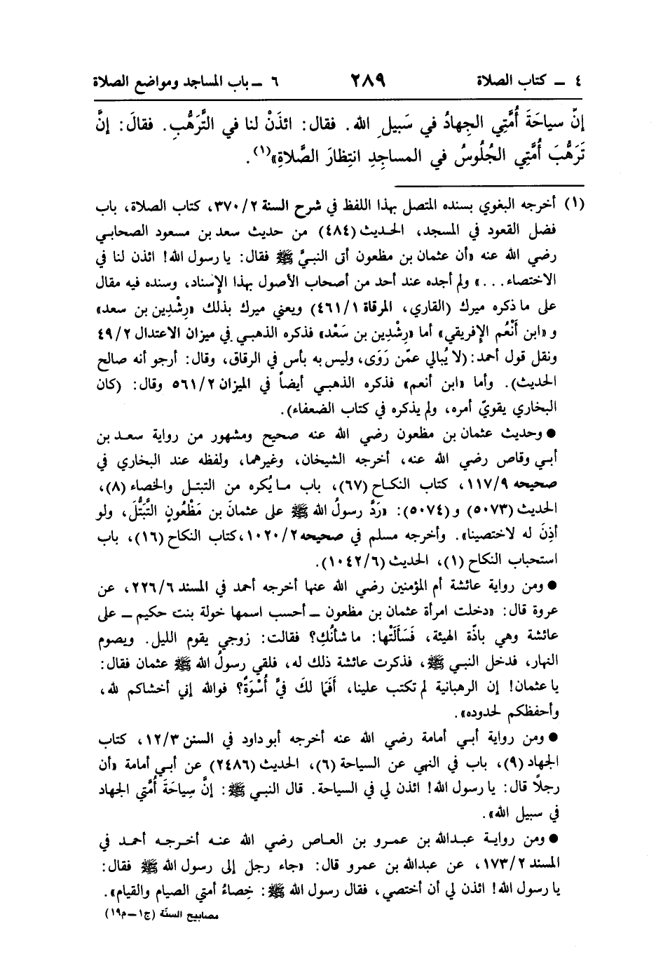 إنّ سياحَةَ أُمَّتِي الجِهادُ في سَبيلِ اللَّه. فقال: ائذَنْ لنا في التَّرَهُّبِ. فقالَ: إنَّ تَرَهُّبَ أُمَّتِي الجُلُوسُ في المساجِدِ انتِظارَ الصَّلاةِ" (¬1).