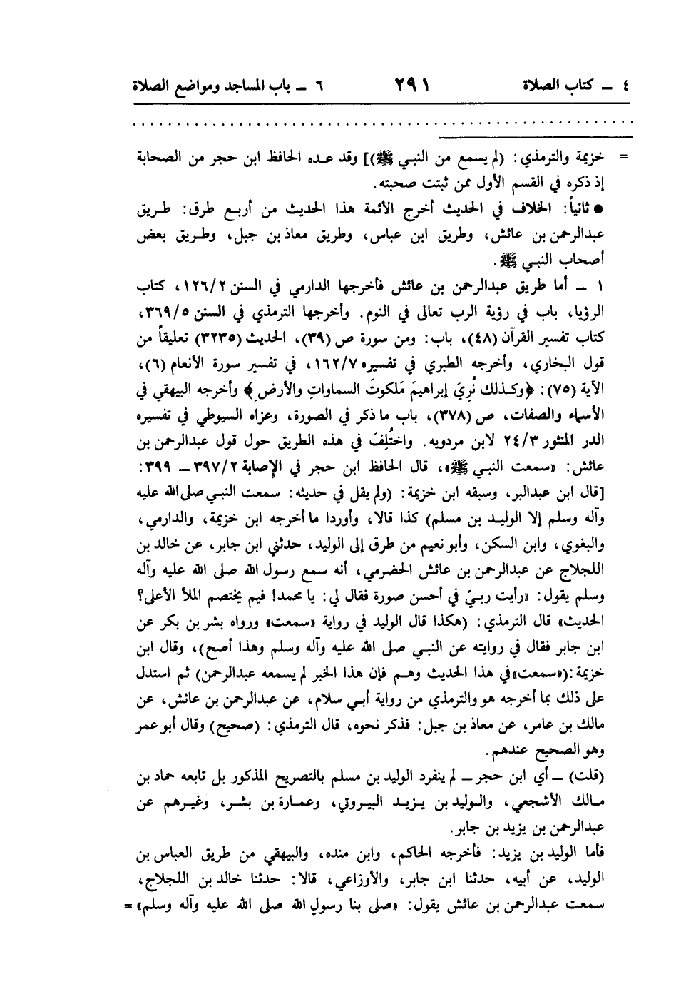1 - أما طريق عبد الرحمن بن عائش فأخرجها الدارمي في السنن 2/ 126، كتاب الرؤيا، باب في رؤية الرب تعالى في النوم. وأخرجها الترمذي في السنن 5/ 369، كتاب تفسير القرآن (48)، باب: ومن سورة ص (39)، الحديث (3235) تعليقًا من قول البخاري، وأخرجه الطبري في تفسيره 7/ 162، في تفسير سورة الأنعام (6)، الآية (75): {وَكَذَلِكَ نُرِي إِبْرَاهِيمَ مَلَكُوتَ السَّمَاوَاتِ وَالْأَرْضِ} وأخرجه البيهقي في الأسماء والصفات، ص (378)، باب ما ذكر في الصورة، وعزاه السيوطي في تفسيره الدر المنثور 3/ 24 لابن مردويه. واختُلِفَ في هذه الطريق حول قول عبد الرحمن بن عائش: "سمعت النبي -صلى اللَّه عليه وسلم-"، قال الحافظ ابن حجر في الإصابة 2/ 397 - 399: [قال ابن عبد البر، وسبقه ابن خزيمة: (ولم يقل في حديثه: سمعت النبي صلى اللَّه عليه وآله وسلم إلا الوليد بن مسلم) كذا قالا، وأوردا ما أخرجه ابن خزيمة، والدارمي، والبغوي، وابن السكن، وأبو نعيم من طرق الى الوليد، حدثني ابن جابر، عن خالد بن اللجلاج عن عبد الرحمن بن عائش الحضرمي، أنه سمع رسول اللَّه صلى اللَّه عليه وآله وسلم يقول: "رأيت ربيّ في أحسن صورة فقال لي: يا محمد! فيم يختصم الملأ الأعلى؟ الحديث" قال الترمذي: (هكذا قال الوليد في رواية "سمعت" ورواه بشر بن بكر عن ابن جابر فقال في روايته عن النبي صلى اللَّه عليه وآله وسلم وهذا أصح)، وقال ابن خزيمة: ("سمعت" في هذا الحديث وهم فإن هذا الخبر لم يسمعه عبد الرحمن) ثم استدل على ذلك بما أخرجه هو والترمذي من رواية أبي سلام، عن عبد الرحمن بن عائش، عن مالك بن عامر، عن معاذ بن جبل: فذكر نحوه، قال الترمذي: (صحيح) وقال أبو عمر وهو الصحيح عندهم.