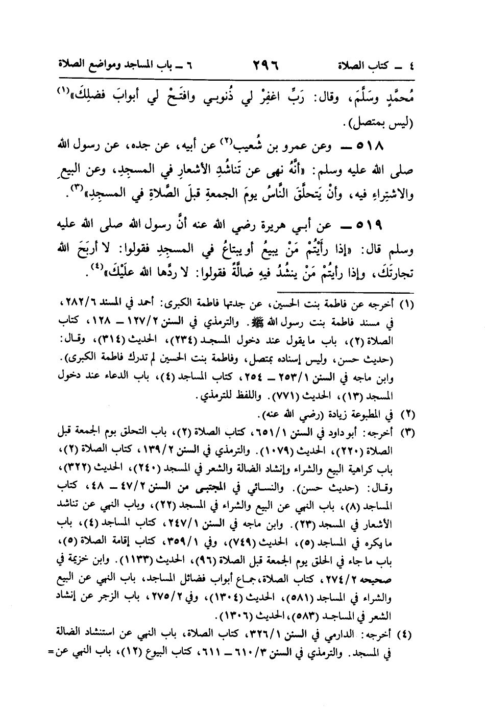 (¬3) أخرجه: أبو داود في السنن 1/ 651، كتاب الصلاة (2)، باب التحلق يوم الجمعة قبل الصلاة (220)، الحديث (1079). والترمذي في السنن 2/ 139، كتاب الصلاة (2)، باب كراهية البيع والشراء وإنشاد الضالة والشعر في المسجد (240)، الحديث (322)، وقال: (حديث حسن). والنسائي في المجتبى من السنن 2/ 47 - 48، كتاب المساجد (8)، باب النهي عن البيع والشراء في المسجد (22)، وباب النهي عن تناشد الأشعار في المسجد (23). وابن ماجه في السنن 1/ 247، كتاب المساجد (4)، باب ما يكره في المساجد (5)، الحديث (749)، وفي 1/ 359، كتاب إقامة الصلاة (5)، باب ما جاء في الحلق يوم الجمعة قبل الصلاة (96)، الحديث (1133). وابن خزيمة في صحيحه 2/ 274، كتاب الصلاة، جماع أبواب فضائل المساجد، باب النهي عن البيع والشراء في المساجد (581)، الحديث (1304)، وفي 2/ 275، باب الزجر عن إنشاد الشعر في المساجد (583)، الحديث (1306).