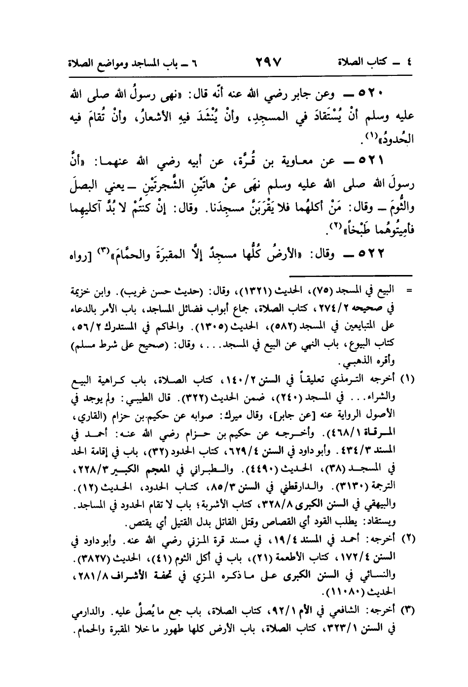 520 - وعن جابر رضي اللَّه عنه أنّه قال: "نهى رسولُ اللَّه صلى اللَّه عليه وسلم أنْ يُسْتَقادَ في المسجِدِ، وأنْ يُنْشَدَ فيهِ الأشعارُ، وأنْ تُقامَ فيه الحُدودُ" (¬1).