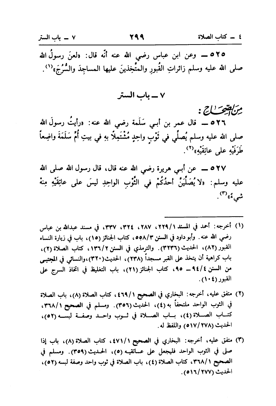 (¬3) متفق عليه، أخرجه: البخاري في الصحيح 1/ 471، كتاب الصلاة (8)، باب إذا صلى في الثوب الواحد فليجعل على عاتقيه (5)، الحديث (359). ومسلم في الصحيح 1/ 368، كتاب الصلاة (4)، باب الصلاة في ثوب واحد وصفة لبسه (52)، الحديث (277/ 516).