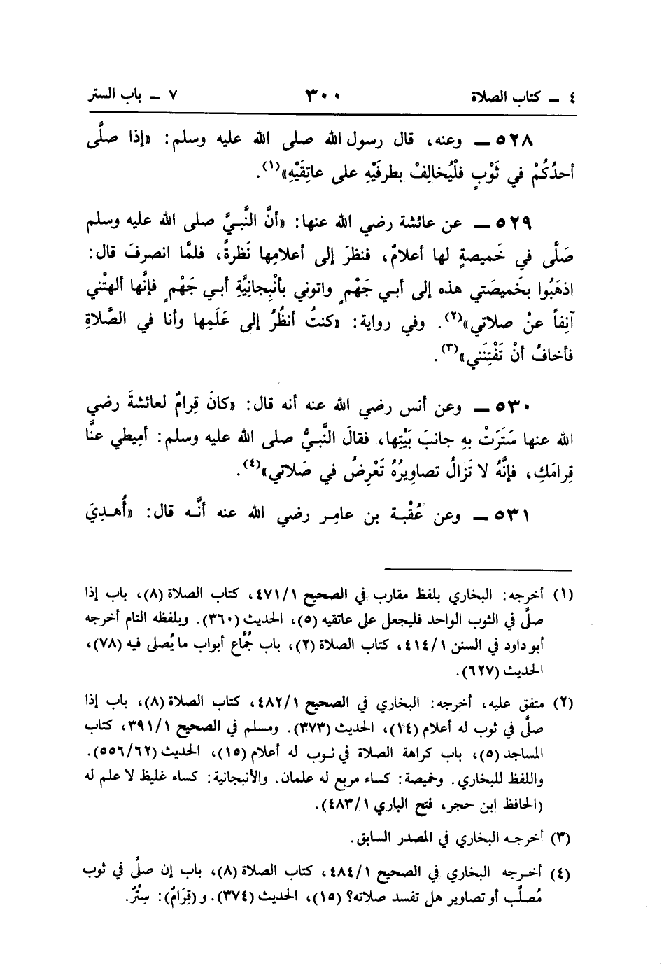 529 - عن عائشة رضي اللَّه عنها: "أنَّ النَّبيَّ صلى اللَّه عليه وسلم صَلَّى في خَميصةٍ لها أعلامٌ، فنظرَ الى أعلامِها نَظرةً، فلمَّا انصرفَ قال: اذهَبُوا بخَميصَتي هذه الى أبي جَهْمٍ واتوني بأنْبِجانيَّةِ أبي جَهْمٍ فإنَّها ألهتْني آنِفًا عنْ صلاتي" (¬2). وفي رواية: "كنتُ أنظُرُ الى عَلَمِها وأنا في الصَّلاةِ فأخافُ أنْ تَفْتِنَني" (¬3).