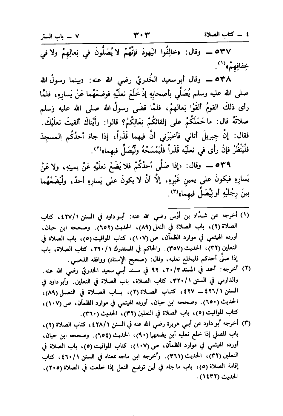 (¬2) أخرجه: أحمد في المسند 3/ 20، 92 في مسند أبي سعيد الخدريّ رضي اللَّه عنه. والدارمي في السنن 1/ 320، كتاب الصلاة، باب الصلاة في النعلين. وأبو داود في السنن 1/ 426 - 427، كتاب الصلاة (2)، باب الصلاة في النعل (89)، الحديث (650). وصححه ابن حبان، أورده الهيثمي في موارد الظمآن، ص (107)، كتاب المواقيت (5)، باب الصلاة في النعلين (32)، الحديث (360).