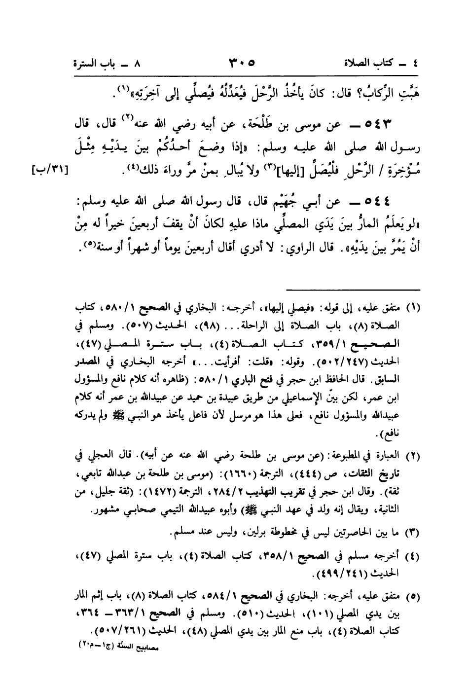 543 - عن موسى بن طَلْحَة، عن أبيه رضي اللَّه عنه (¬2) قال، قال رسول اللَّه صلى اللَّه عليه وسلم: "إذا وضعَ أحدُكُمْ بينَ يدَيْهِ مِثْلَ مؤخِرَةِ الرَّحْلِ فلْيُصَلِّ [إليها] (¬3) ولا يُبالِ بمنْ مرَّ وراءَ ذلك (¬4).