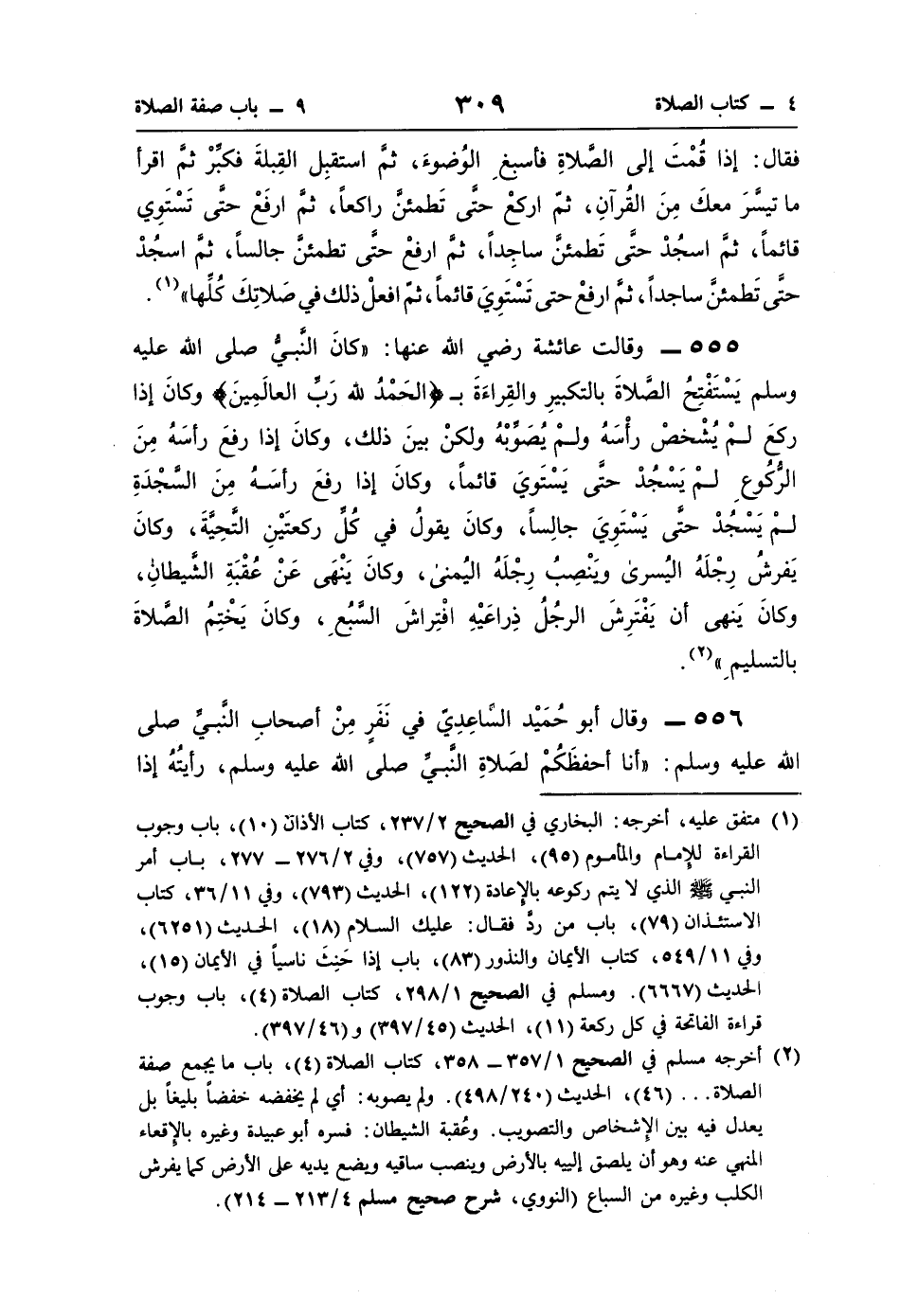 555 - وقالت عائشة رضي اللَّه عنها: "كانَ النَّبيُّ صلى اللَّه عليه وسلم يَسْتَفْتِحُ الصَّلاةَ بالتكبيرِ والقِراءَةَ بـ {الْحَمْدُ لِلَّهِ رَبِّ الْعَالَمِينَ} وكانَ إذا ركعَ لمْ يُشْخصْ رأْسَهُ ولمْ يُصَوِّبْهُ ولكنْ بينَ ذلك، وكانَ إذا رفعَ رأسَهُ مِنَ الرُّكُوعِ لمْ يَسْجُدْ حتَّى يَسْتَويَ قائمًا، وكانَ إذا رفعَ رأسَهُ مِنَ السَّجْدَةِ لمْ يَسْجُدْ حتَّى يَسْتَوِيَ جالِسًا، وكانَ يقولُ في كُلِّ ركعتَيْنِ التَّحِيَّةَ، وكانَ يَفرشُ رِجْلَهُ اليُسرى ويَنْصِبُ رِجْلَهُ اليُمنى، وكانَ يَنْهَى عَنْ عُقْبَةِ الشَّيطانِ، وكانَ يَنهى أن يَفْتَرِشَ الرجُلُ ذِراعَيْهِ افْتِراشَ السَّبُعِ، وكانَ يَخْتِمُ الصَّلاةَ بالتسليمِ" (¬2).