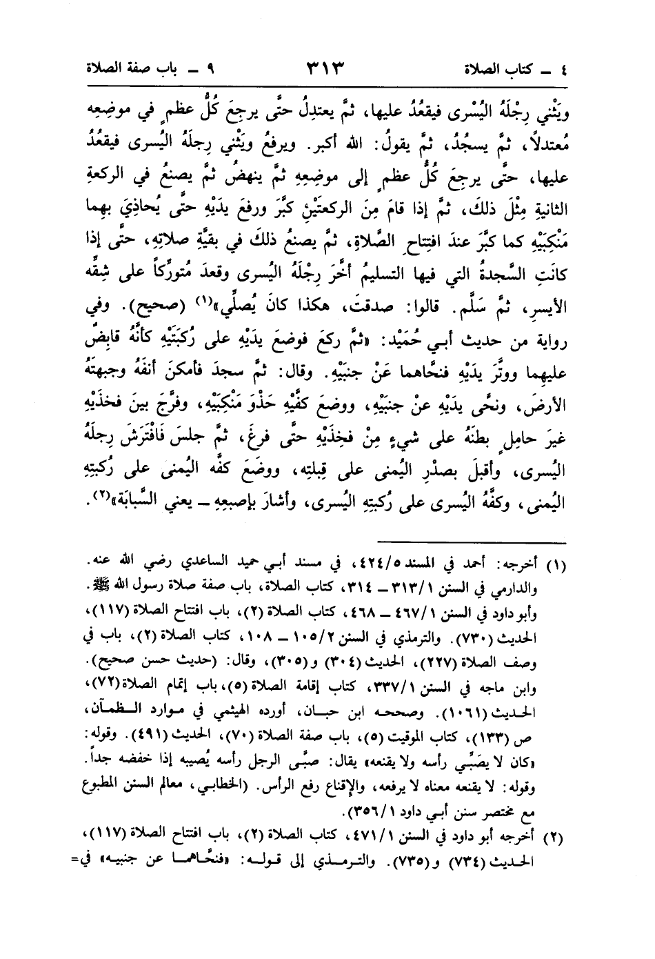 (¬1) أخرجه: أحمد في المسند 5/ 424، في مسند أبي حميد الساعدي رضي اللَّه عنه. والدارمي في السنن 1/ 313 - 314، كتاب الصلاة، باب صفة صلاة رسول اللَّه -صلى اللَّه عليه وسلم-. وأبو داود في السنن 1/ 467 - 468، كتاب الصلاة (2)، باب افتتاح الصلاة (117)، الحديث (730). والترمذي في السنن 2/ 105 - 108، كتاب الصلاة (2)، باب في وصف الصلاة (227)، الحديث (304) و (305)، وقال: (حديث حسن صحيح). وابن ماجه في السنن 1/ 337، كتاب إقامة الصلاة (5)، باب إتمام الصلاة (72)، الحديث (1061). وصححه ابن حبان، أورده الهيثمي في موارد الظمآن، ص (133)، كتاب الموقيت (5)، باب صفة الصلاة (70)، الحديث (491). وقوله: "كان لا يصَبِّي رأسه ولا يقنعه" يقال: صبَّى الرجل رأسه يُصيبه إذا خفضه جدًا. وقوله: لا يقنعه معناه لا يرفعه، والإقناع رفع الرأس. (الخطابي، معالم السنن المطبوع مع مختصر سنن أبي داود 1/ 356).
