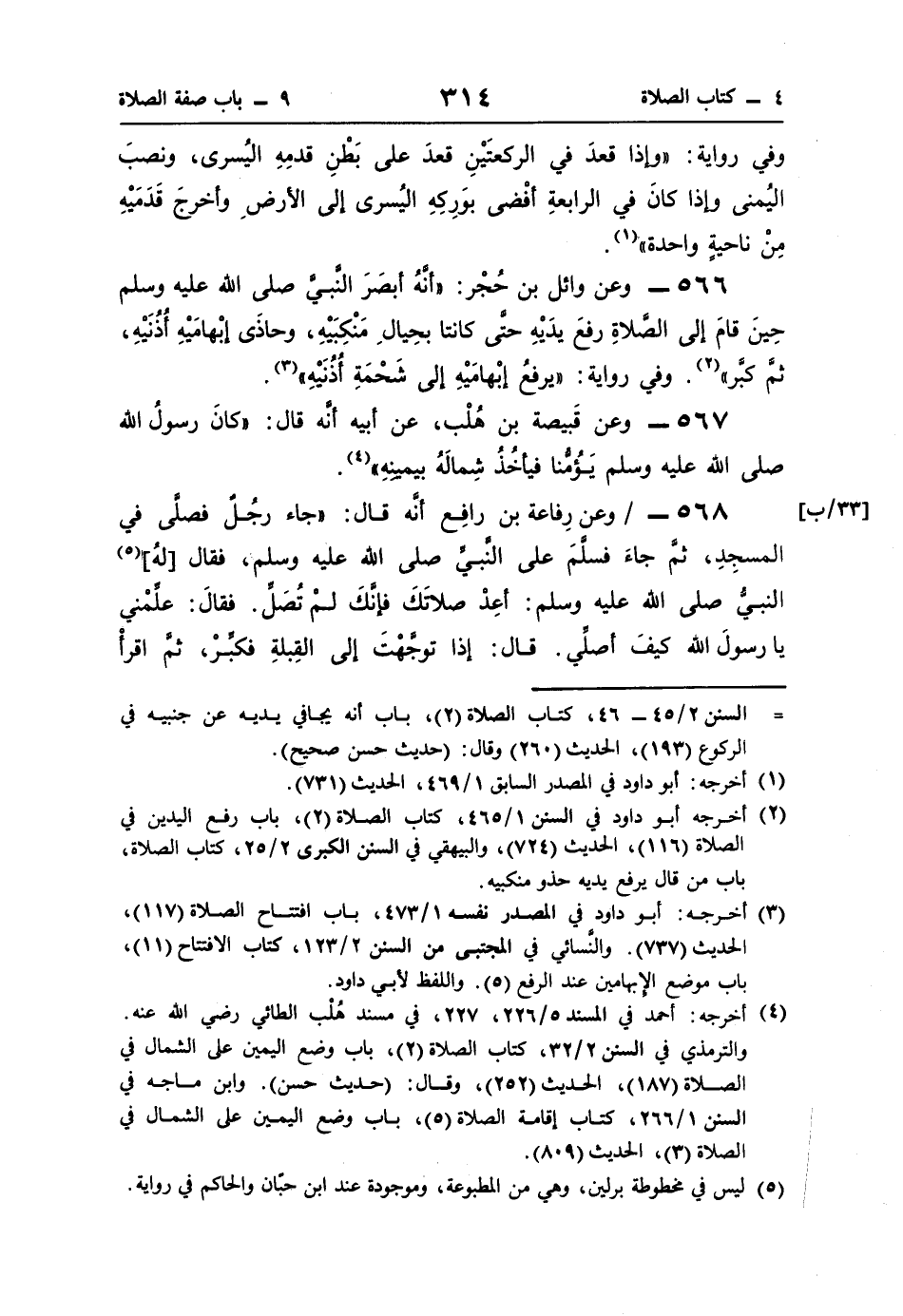 (¬4) أخرجه: أحمد في المسند 5/ 226، 227، في مسند هُلْب الطائي رضي اللَّه عنه. والترمذي في السنن 2/ 32، كتاب الصلاة (2)، باب وضع اليمين على الشمال في الصلاة (187)، الحديث (252)، وقال: (حديث حسن). وابن ماجه في السنن 1/ 266، كتاب إقامة الصلاة (5)، باب وضع اليمين على الشمال في الصلاة (3)، الحديث (809).