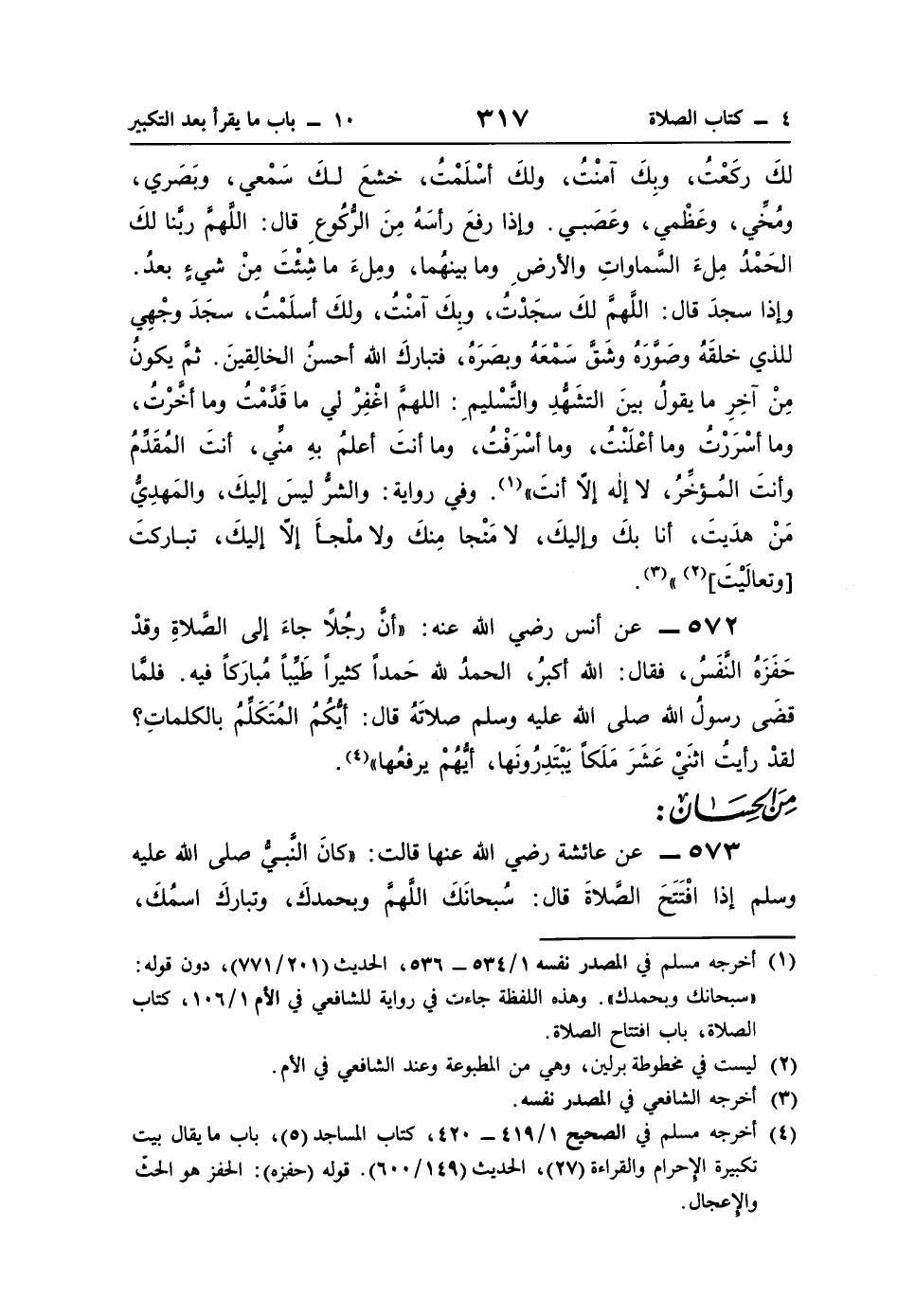 (¬1) أخرجه مسلم في المصدر نفسه 1/ 534 - 536، الحديث (201/ 771)، دون قوله: "سبحانك وبحمدك". وهذه اللفظة جاءت في رواية للشافعي في الأم 1/ 106، كتاب الصلاة، باب افتتاح الصلاة.