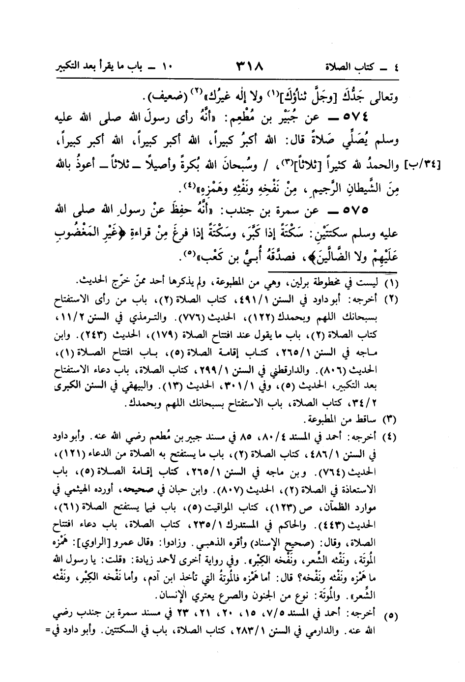 574 - عن جُبَيْر بن مُطْعِم: "أنَّهُ رأى رسولَ اللَّه صلى اللَّه عليه وسلم يُصَلِّي صَلاةً قال: اللَّه أكبرُ كبيرًا، اللَّه أكبر كبيرًا، اللَّه أكبر كبيرًا، والحمدُ للَّه كثيرًا [ثلاثًا] (¬3)، وسُبحانَ اللَّه بُكرةً وأصيلًا -ثلاثًا- أعوذُ باللَّه مِنَ الشَّيطانِ الرَّجيمِ، مِنْ نَفْخِهِ ونَفْثِهِ وهَمْزهِ" (¬4).
