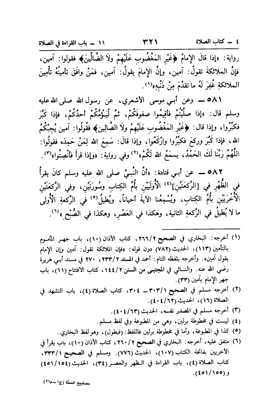 582 - عن أبي قتادة: "أنَّ النَّبيَّ صلى اللَّه عليه وسلم كانَ يقرأُ في الظُّهْرِ في [الرَّكعَتَيْنِ] (¬4) الأُولَيَيْنِ بأُمِّ الكِتابِ وسُورَتَيْنِ، وفي الرَّكعَتَيْنِ الأُخْرَيَيْنِ بأُمِّ الكِتابِ، ويُسْمِعُنا الآيةَ أحيانًا، ويُطيلُ (¬5) في الرَّكعةِ الأُولى ما لا يُطيلُ في الرَّكعةِ الثانية، وهكذا في العَصْرِ، وهكذا في الصُّبْحِ" (¬6).