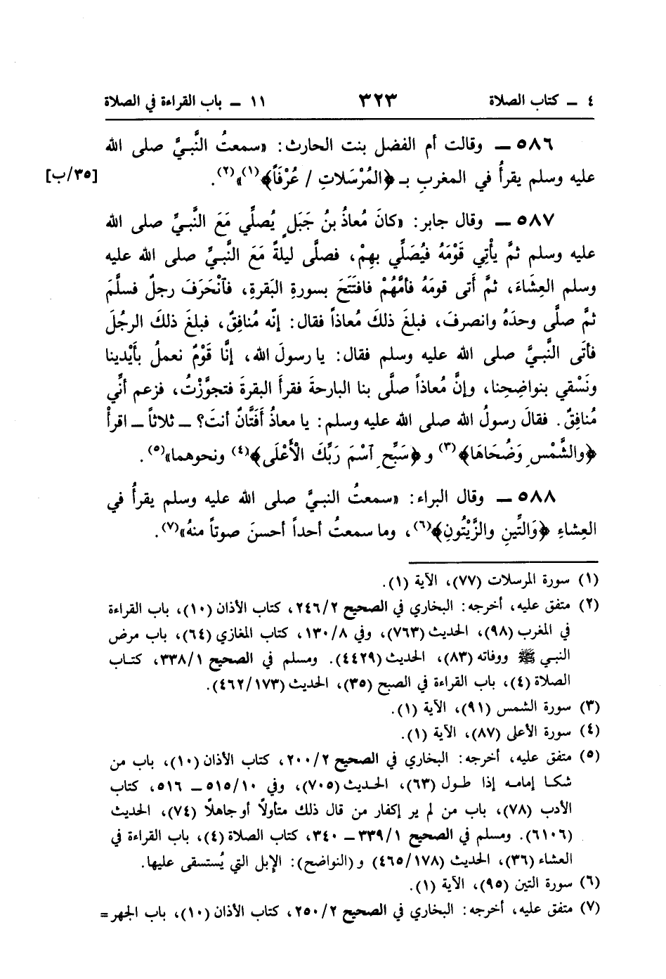 586 - وقالت أم الفضل بنت الحارث: "سمعتُ النَّبيَّ صلى اللَّه عليه وسلم يقرأُ في المغربِ بـ {وَالْمُرْسَلَاتِ عُرْفًا} (¬1) " (¬2).