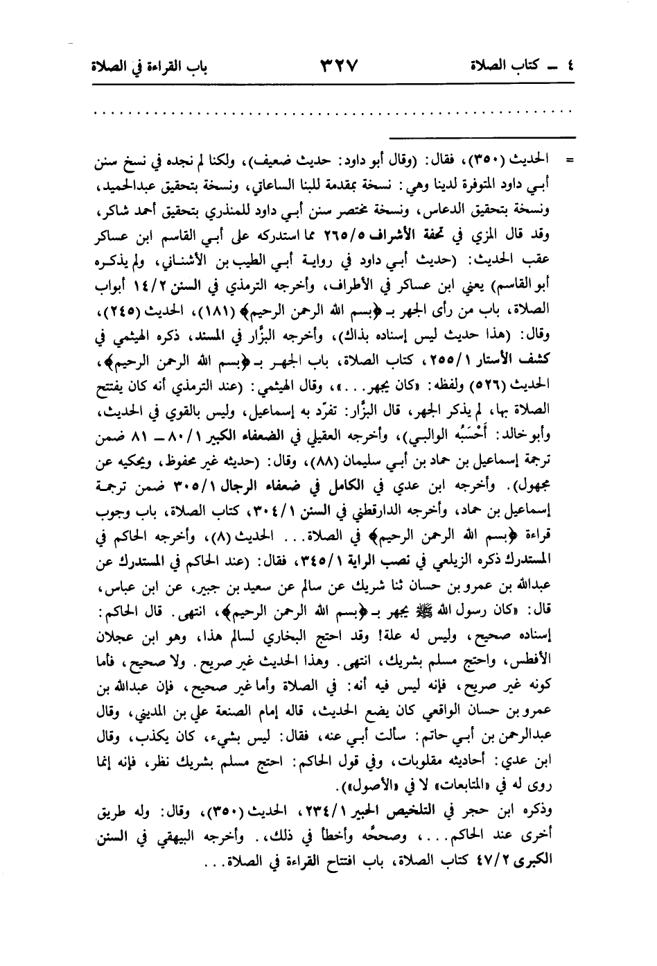 = الحديث (350)، فقال: (وقال أبو داود: حديث ضعيف)، ولكنا لم نجده في نسخ سنن أبي داود المتوفرة لدينا وهي: نسخة بمقدمة للبنا الساعاتي، ونسخة بتحقيق عبد الحميد، ونسخة بتحقيق الدعاس، ونسخة مختصر سنن أبي داود للمنذري بتحقيق أحمد شاكر، وقد قال المزي في تحفة الأشراف 5/ 265 مما استدركه على أبي القاسم ابن عساكر عقب الحديث: (حديث أبي داود في رواية أبي الطيب بن الأشناني، ولم يذكره أبو القاسم) يعني ابن عساكر في الأطراف، وأخرجه الترمذي في السنن 2/ 14 أبواب الصلاة، باب من رأى الجهر بـ {بِسْمِ اللَّهِ الرَّحْمَنِ الرَّحِيمِ} (181)، الحديث (245)، وقال: (هذا حديث ليس إسناده بذاك)، وأخرجه البزار في المسند، ذكره الهيثمي في كشف الأستار 1/ 255، كتاب الصلاة، باب الجهر بـ {بِسْمِ اللَّهِ الرَّحْمَنِ الرَّحِيمِ}، الحديث (526) ولفظه: "كان يجهر. . . "، وقال الهيثمي: (عند الترمذي أنه كان يفتتح الصلاة بها، لم يذكر الجهر، قال البزَّار: تفرّد به إسماعيل، وليس بالقوي في الحديث، وأبو خالد: أَحْسَبه الوالبي)، وأخرجه العقيلي في الضعفاء الكبير 1/ 80 - 81 ضمن ترجمة إسماعيل بن حماد بن أبي سليمان (88)، وقال: (حديثه غير محفوظ، ويحكيه عن مجهول). وأخرجه ابن عدي في الكامل في ضعفاء الرجال 1/ 305 ضمن ترجمة إسماعيل بن حماد، وأخرجه الدارقطني في السنن 1/ 304؛ كتاب الصلاة، باب وجوب قراءة {بِسْمِ اللَّهِ الرَّحْمَنِ الرَّحِيمِ} في الصلاة. . . الحديث (8)، وأخرجه الحاكم في المستدرك ذكره الزيلعي في نصب الراية 1/ 345، فقال: (عند الحاكم في المستدرك عن عبد اللَّه بن عمرو بن حسان ثنا شريك عن سالم عن سعيد بن جبير، عن ابن عباس، قال: "كان رسول اللَّه صلى اللَّه عليه وسلم يجهر بـ {بِسْمِ اللَّهِ الرَّحْمَنِ الرَّحِيمِ}، انتهى. قال الحاكم: إسناده صحيح، وليس له علة! وقد احتج البخاري لسالم هذا، وهو ابن عجلان الأفطس، واحتج مسلم بشريك، انتهى. وهذا الحديث غير صريح. ولا صحيح، فأما كونه غير صريح، فإنه ليس فيه أنه: في الصلاة وأما غير صحيح، فإن عبد اللَّه بن عمرو بن حسان الواقعي كان يضع الحديث، قاله إمام الصنعة علي بن المديني، وقال عبد الرحمن بن أبي حاتم: سألت أبي عنه، فقال: ليس بشيء، كان يكذب، وقال ابن عدي: أحاديثه مقلوبات، وفي قول الحاكم: احتج مسلم بشريك نظر، فإنه إنما روى له في "المتابعات" لا في "الأصول").