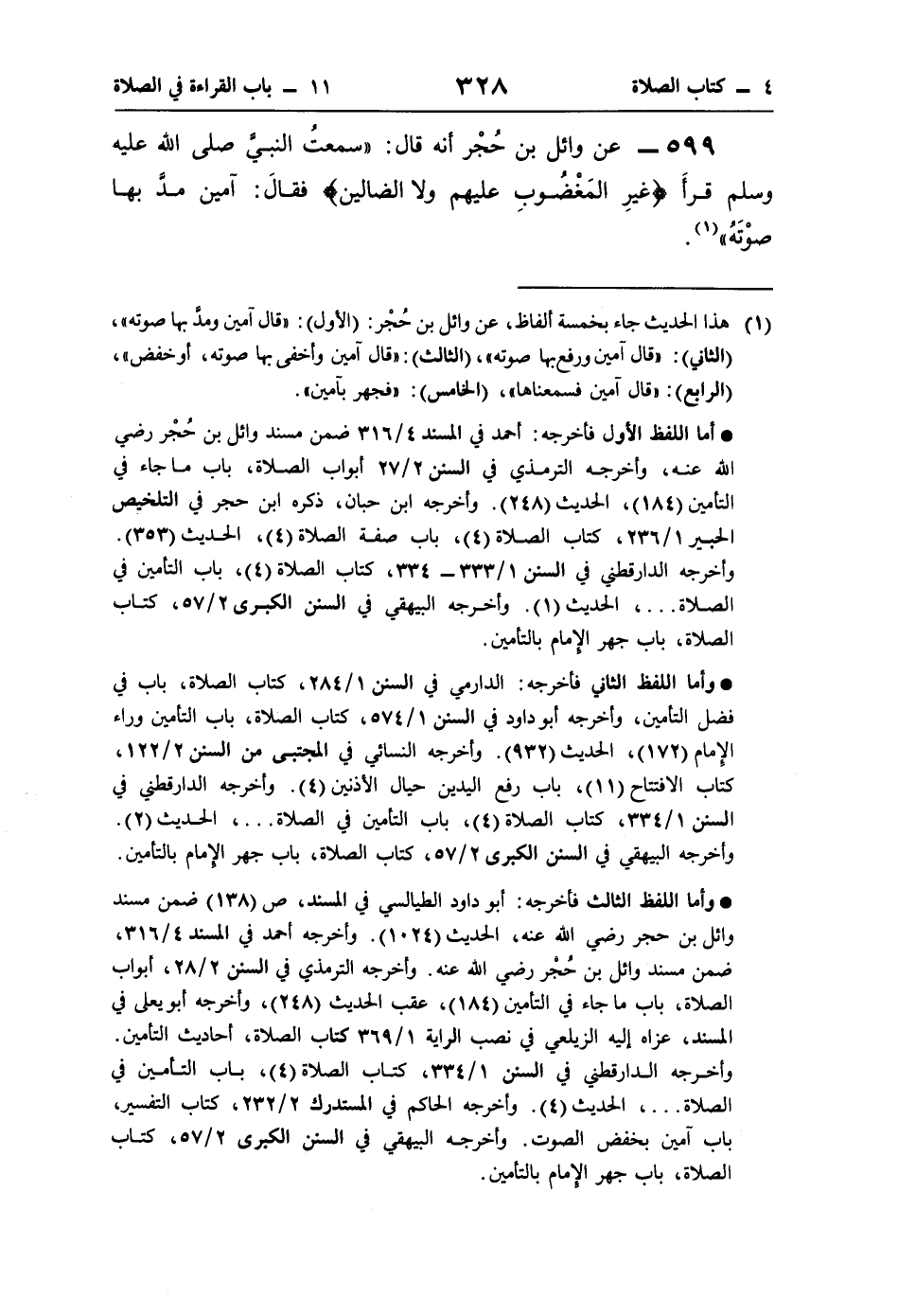 (¬1) هذا الحديث جاء بخمسة ألفاظ، عن وائل بن حُجْر: (الأول): "قال آمين ومدَّ بها صوته"، (الثاني): "قال آمين ورفع بها صوته"، (الثالث): "قال آمين وأخفى بها صوته، أو خفض"، (الرابع): "قال آمين فسمعناها"، (الخامس): "فجهر بآمين".