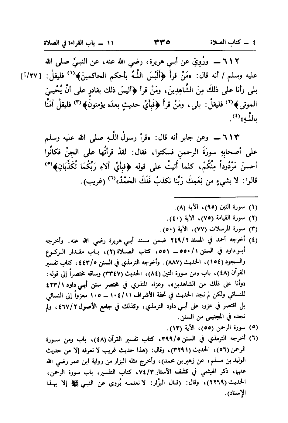 (¬4) أخرجه أحمد في المسند 2/ 249 ضمن مسند أبي هريرة رضي اللَّه عنه. وأخرجه أبو داود في السنن 1/ 550 - 551، كتاب الصلاة (2)، باب مقدار الركوع والسجود (154)، الحديث (887). وأخرجه الترمذي في السنن 5/ 443، كتاب تفسير القرآن (48)، باب ومن سورة التين (84)، الحديث (3347) وساقه مختصرًا إلى قوله: "وأنا على ذلك من الشاهدين"، وعزاه المنذري في مختصر سنن أبي داود 1/ 423 للنسائي ولكن لم نجو الحديث في تحفة الأشراف 11/ 104 - 105 معزوًا إلى النسائي بل اقتصر في عزوه على أبي داود الترمذي، وكذلك في جامع الأصول 2/ 467، ولم نجده في المجتبى من السنن.