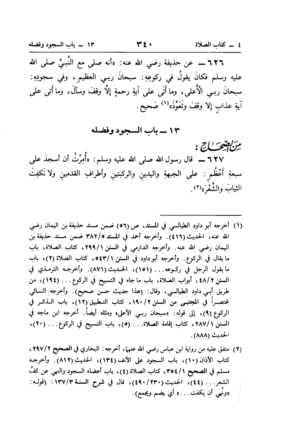 627 - قال رسول اللَّه صلى اللَّه عليه وسلم: "أُمِرْت أن أسجدَ على سبعةِ أَعْظُمٍ: على الجبهةِ واليدينِ والركبتينِ وأطرافِ القدمينِ ولا نَكفِتَ الثيابَ والشَّعْرَ" (¬2).