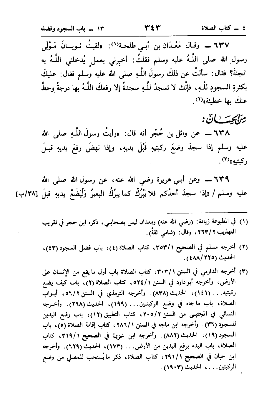 637 - وقال مَعْدَان بن أبي طلحة (¬1): "لقيتُ ثوبانَ مَوْلَى رسولِ اللَّه صلى اللَّهُ عليه وسلم فقلتُ: أخبِرني بعمل يُدخلني اللَّهُ به الجنةَ؟ فقال: سألتُ عن ذلكَ رسولَ اللَّه صلى اللَّه عليه وسلم فقال: عليكَ بكثرةِ السجودِ للَّهِ، فإنَّك لا تسجدُ للَّهِ سجدةً إلا رفعكَ اللَّهُ بها درجةً وحطَّ عنكَ بها خطيئة" (¬2).