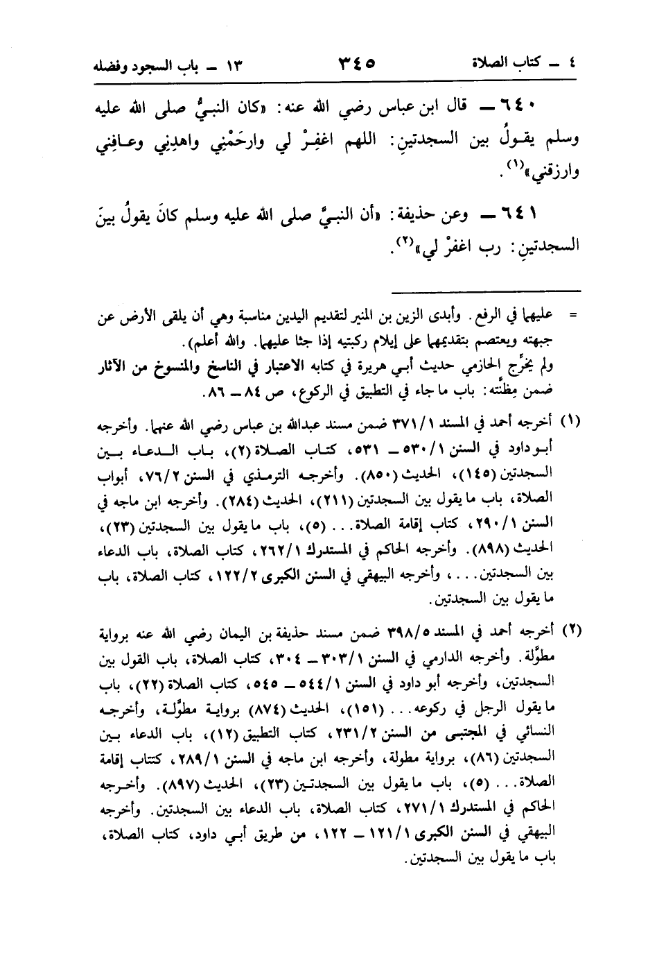 641 - وعن حذيفة: "أنَّ النَّبيَّ صلى اللَّه عليه وسلم كانَ يقولُ بينَ السجدتينِ: رب اغفرْ لي" (¬2).