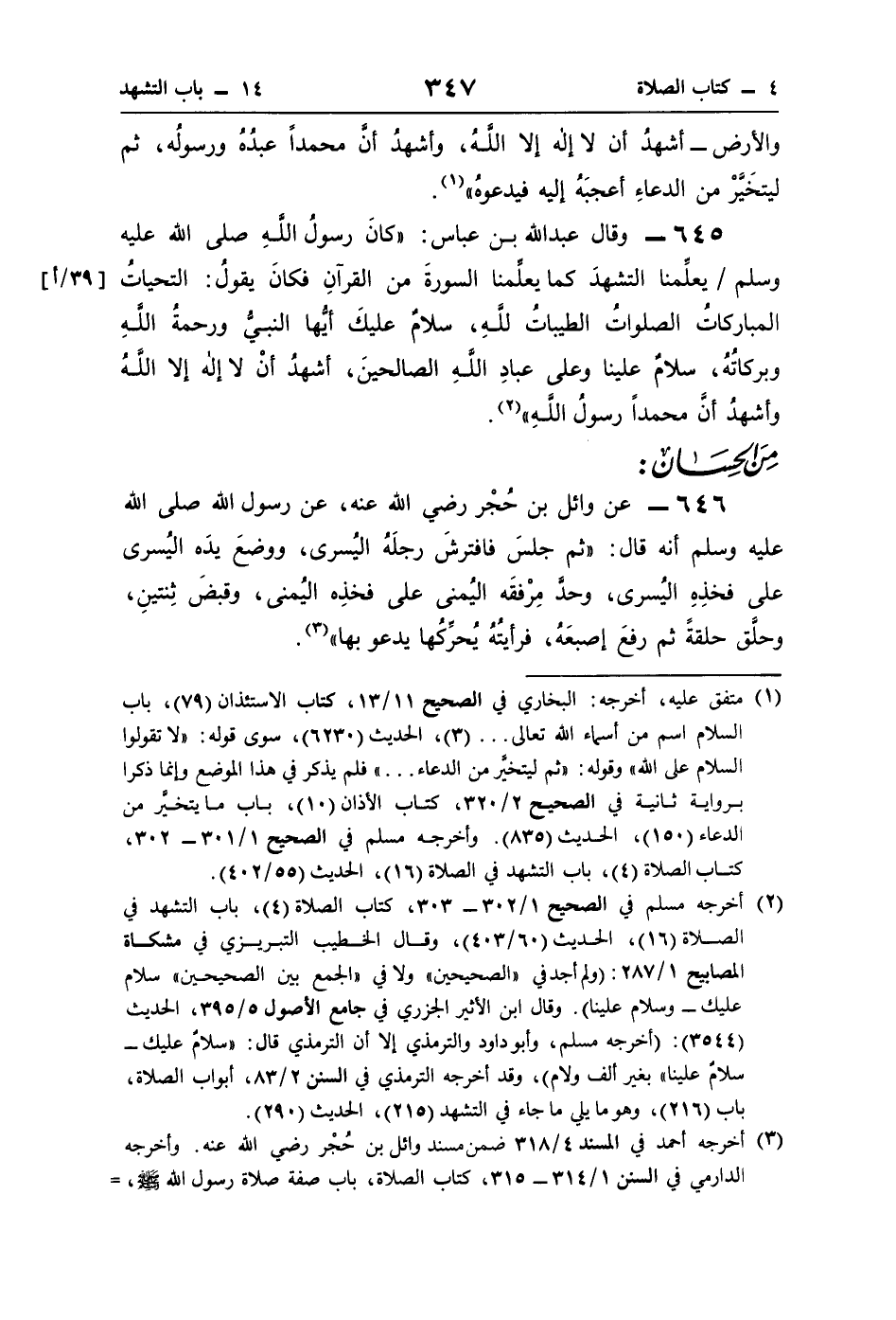 (¬2) أخرجه مسلم في الصحيح 1/ 302 - 303، كتاب الصلاة (4)، باب التشهد في الصلاة (16)، الحديث (60/ 403)، وقال الخطيب التبريزي في مشكاة المصابيح 1/ 287: (ولم أجد في "الصحيحين" ولا في "الجمع بين الصحيحين" سلام عليك - وسلام علينا). وقال ابن الأثير الجزري في جامع الأصول 5/ 395، الحديث (3544): (أخرجه مسلم، وأبو داود والترمذي إلا أن الترمذي قال: "سلامٌ عليك - سلامٌ علينا" بغير ألف ولام)، وقد أخرجه الترمذي في السنن 2/ 83، أبواب الصلاة، باب (216)، وهوما يلي ما جاء في التشهد (215)، الحديث (290).