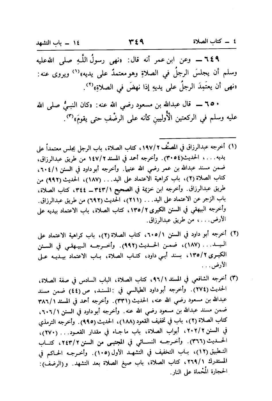 (¬1) أخرجه عبد الرزاق في المصنَّف 2/ 197، كتاب الصلاة، باب الرجل يجلس معتمدًا على يديه. . .، الحديث (3054). وأخرجه أحمد في المسند 2/ 147 من طريق عبد الرزاق، ضمن مسند عبد اللَّه بن عمر رضي اللَّه عنهما. وأخرجه أبو داود في السنن 1/ 604، كتاب الصلاة (2)، باب كراهية الاعتماد على اليد. . . (187)، الحديث (992) من طريق عبد الرزاق. وأخرجه ابن خزيمة في الصحيح 1/ 343 - 344، كتاب الصلاة، باب الزجر عن الاعتماد على اليد. . . (211)، الحديث (692) من طريق عبد الرزاق. وأخرجه البيهقي في السنن الكبرى 2/ 135، كتاب الصلاة، باب الاعتماد بيديه على الأرض. . .، من طريق عبد الرزاق.