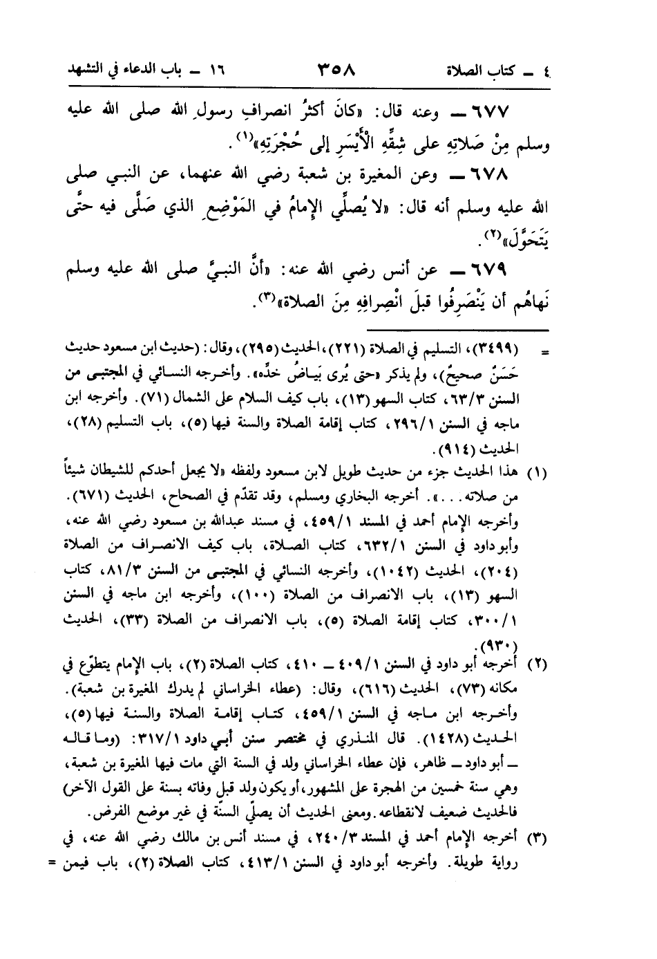 (¬2) أخرجه أبو داود في السنن 1/ 409 - 410، كتاب الصلاة (2)، باب الإِمام يتطوّع في مكانه (73)، الحديث (616)، وقال: (عطاء الخراساني لم يدرك المغيرة بن شعبة). وأخرجه ابن ماجه في السنن 1/ 459، كتاب إقامة الصلاة والسنة فيها (5)، الحديث (1428). قال المنذري في مختصر سنن أبي داود 1/ 317: (وما قاله -أبو داود- ظاهر، فإن عطاء الخراساني ولد في السنة التي مات فيها المغيرة بن شعبة، وهي سنة خمسين من الهجرة على المشهور، أو يكون ولد قبل وفاته بسنة على القول الآخر) فالحديث ضعيف لانقطاعه. ومعنى الحديث أن يصلّي السنّة في غير موضع الفرض.